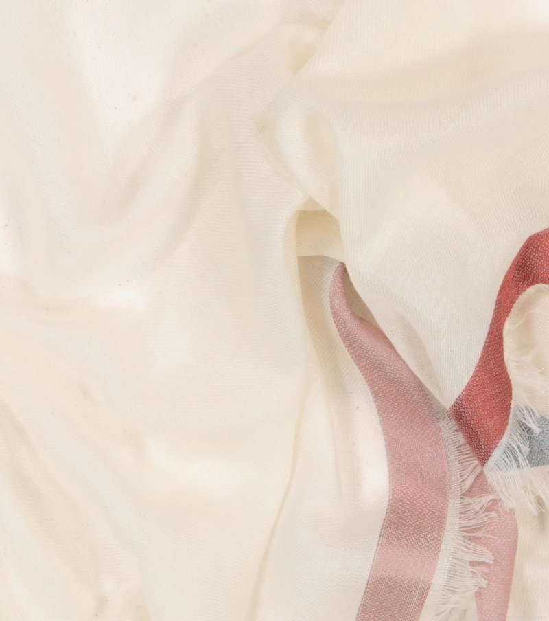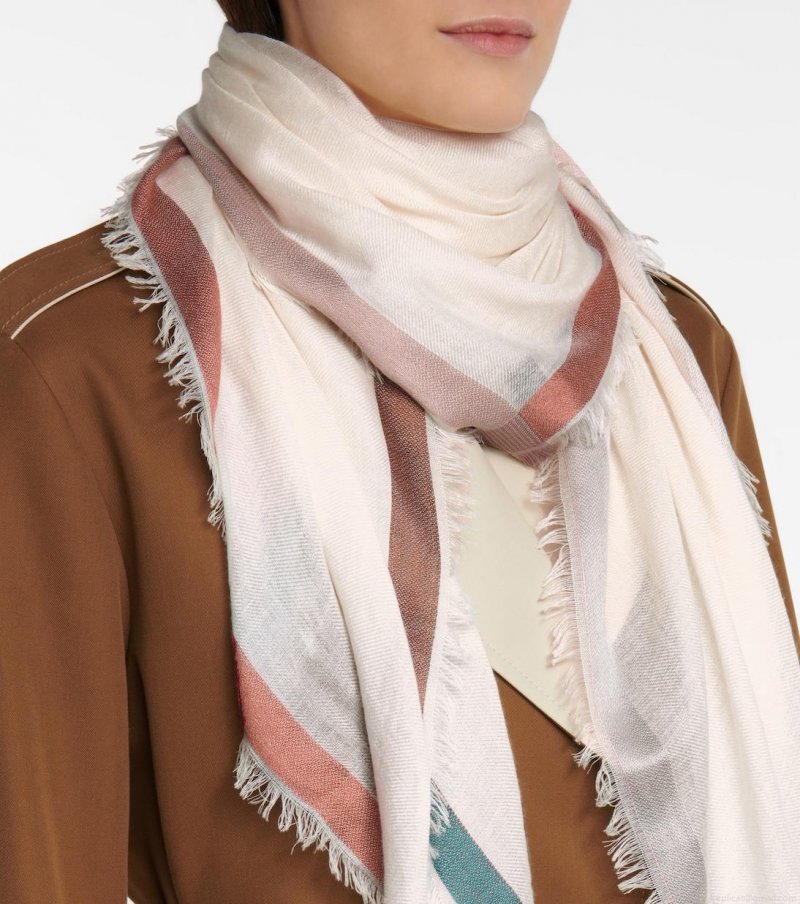 This whisper-weight cashmere and silk scarf from Loro Piana is cast in summer-ready white with a colorful border. The Italian-made piece will add a bright touch to any ensemble, and looks glamorous whether worn around the neck or as a headscarf.
