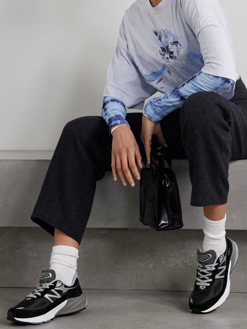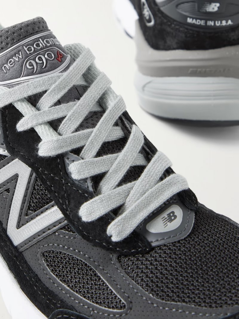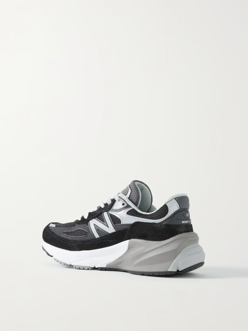 - Black mesh, black and dark-gray suede, silver and black leather