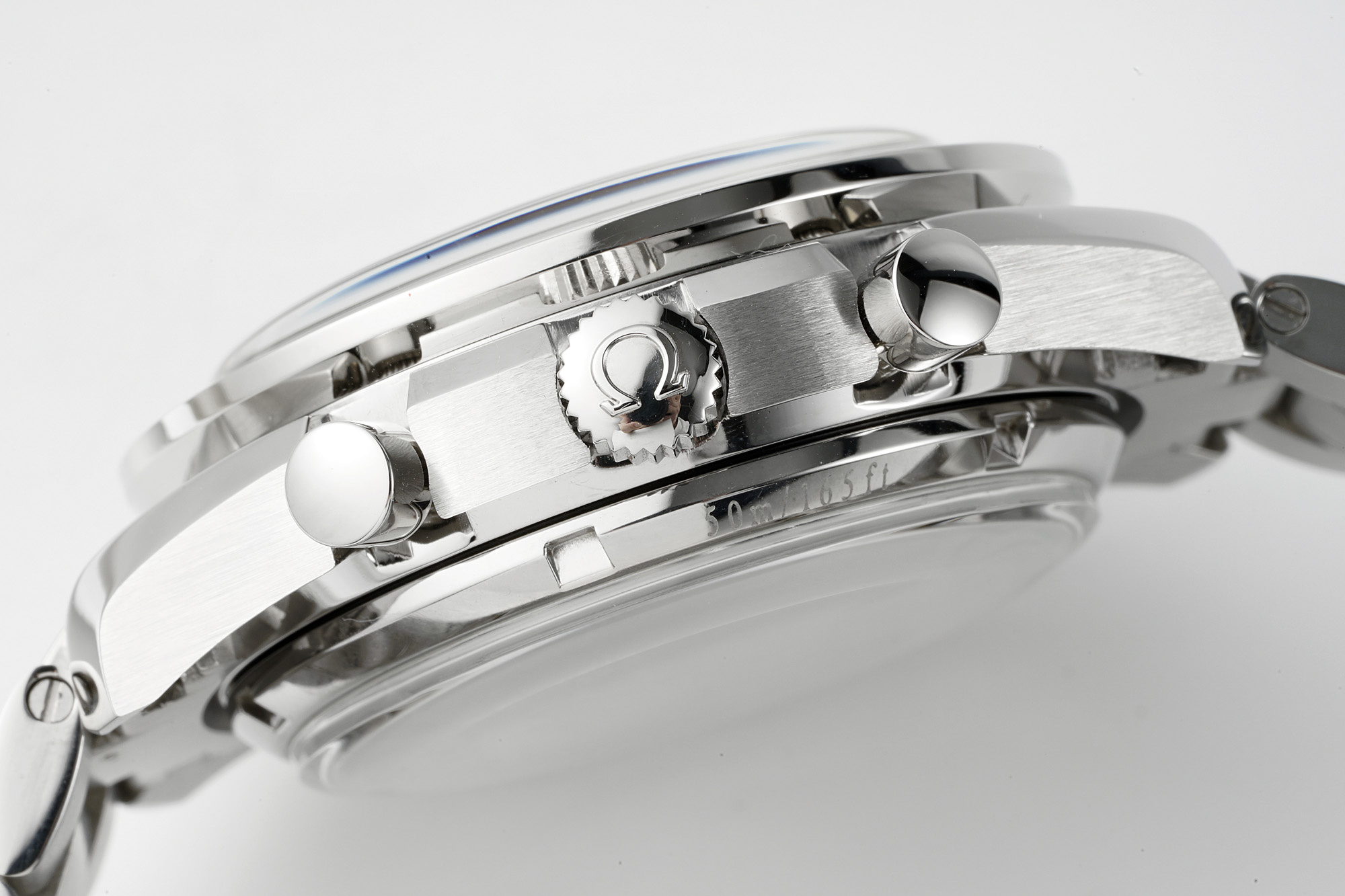 This watch features the Omega 9900 chronograph movement and the steel used is made of imported AISI316L special steel with hardened treatment, resulting in a hardness of 240HV. The sandblasted texture on the case is clear, delicate, and pure white, without any pores, perfectly reproducing the authentic material. The transparent curved sapphire crystal adds to the prominence of the dial. The matte dial is paired with platinum-plated indexes, and the luminous material is made of imported super luminous powder. The Supermaster Moonwatch series comes with a stainless steel bracelet and an imported leather strap, and the bracelet and ceramic bezel can be interchanged with the original version. We may never reach space, but we can at least own an Omega Moonwatch in our lifetime.