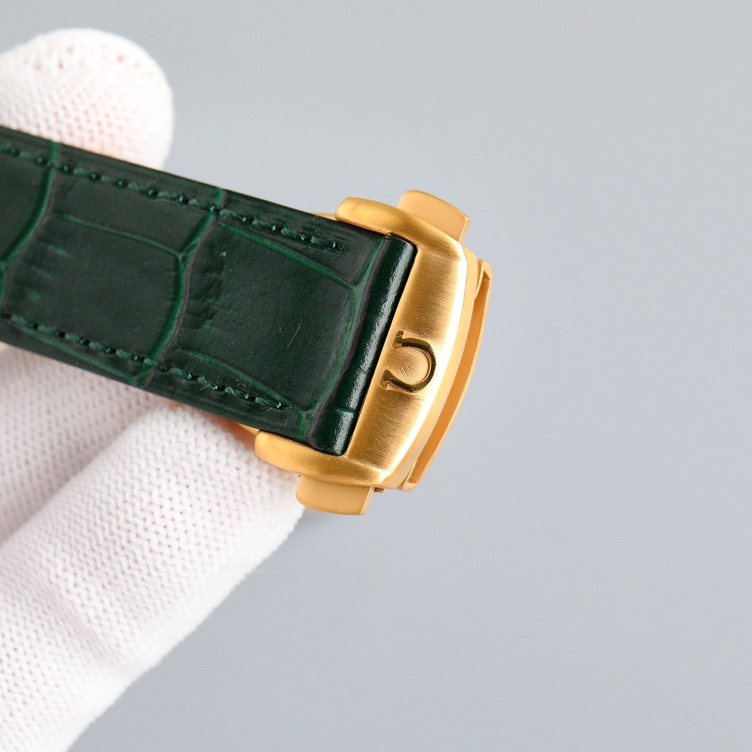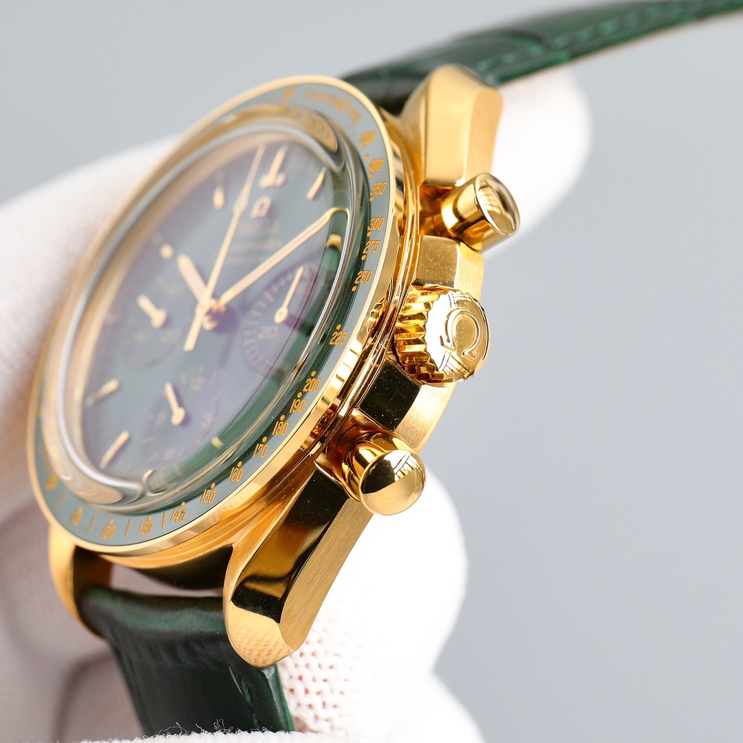 This Moonwatch is inspired by the style of the fourth generation Speedmaster watches. It comes with an integrated black rubber strap and is crafted from Moonshine 18K gold, giving it an elegant and timeless tone. The watch features a Moonshine 18K gold stepped dial with sunray brushed effect, blackened sub-dials and hour markers, a ceramic bezel adorned with a tachymeter scale made using OMEGA Ceragold technology, and the iconic Dot Over Ninety seen on early Speedmaster models, paying tribute to the illustrious lunar landing history of the Speedmaster.