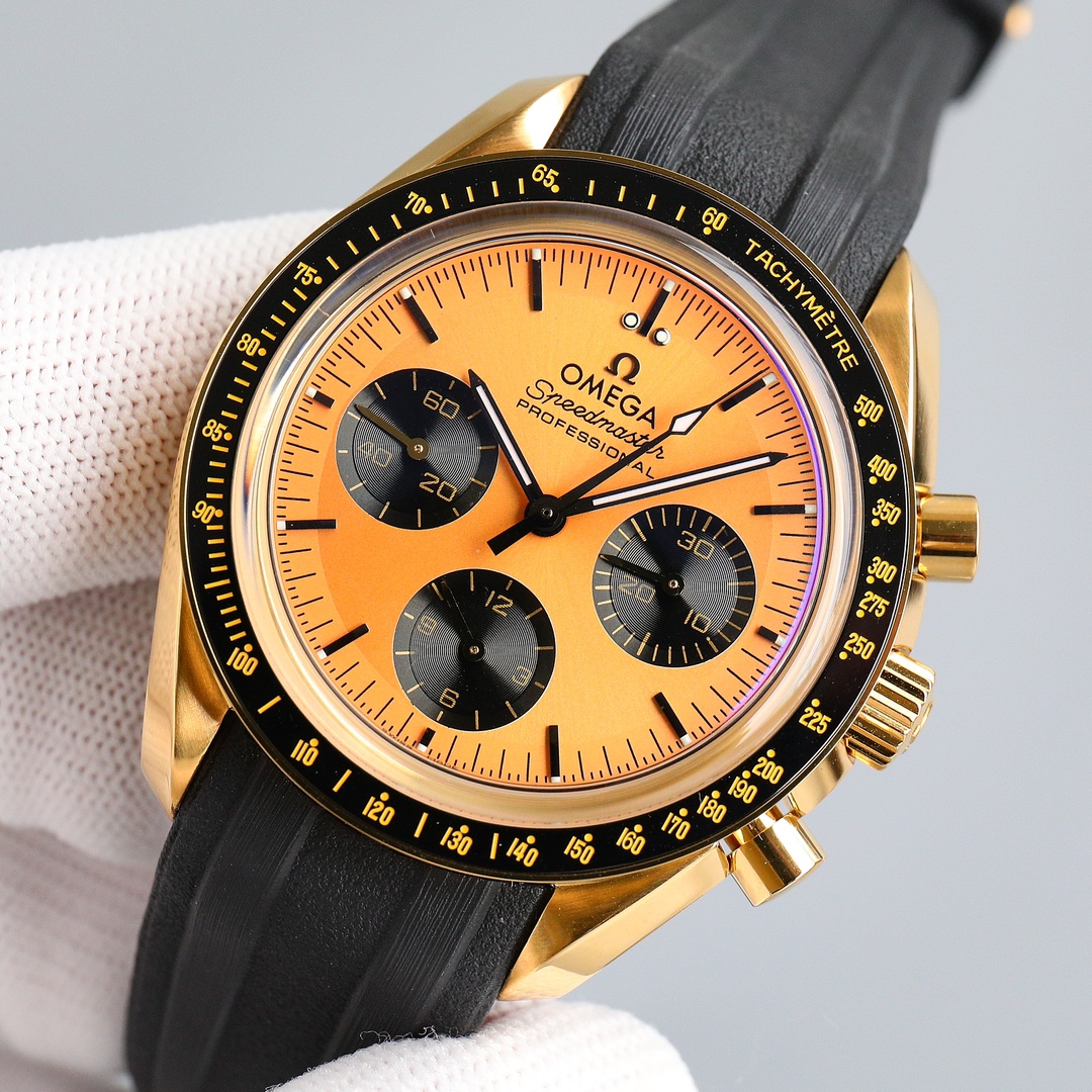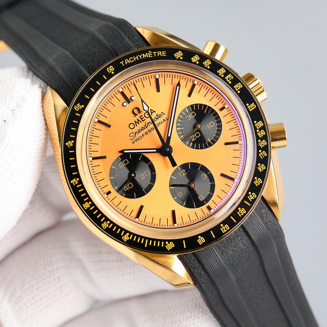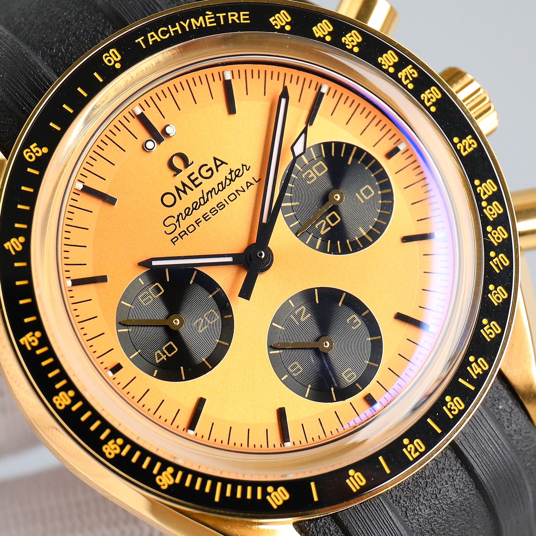 This Moonwatch is inspired by the style of the fourth generation Speedmaster watches. It comes with an integrated black rubber strap and is crafted from Moonshine 18K gold, giving it an elegant and timeless tone. The watch features a Moonshine 18K gold stepped dial with sunray brushed effect, blackened sub-dials and hour markers, a ceramic bezel adorned with a tachymeter scale made using OMEGA Ceragold technology, and the iconic Dot Over Ninety seen on early Speedmaster models, paying tribute to the illustrious lunar landing history of the Speedmaster.