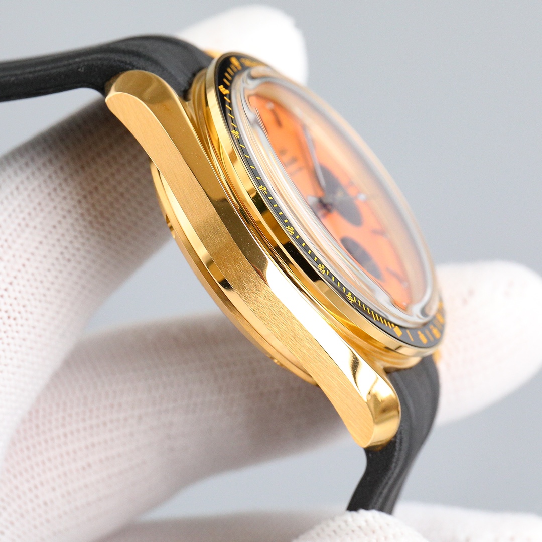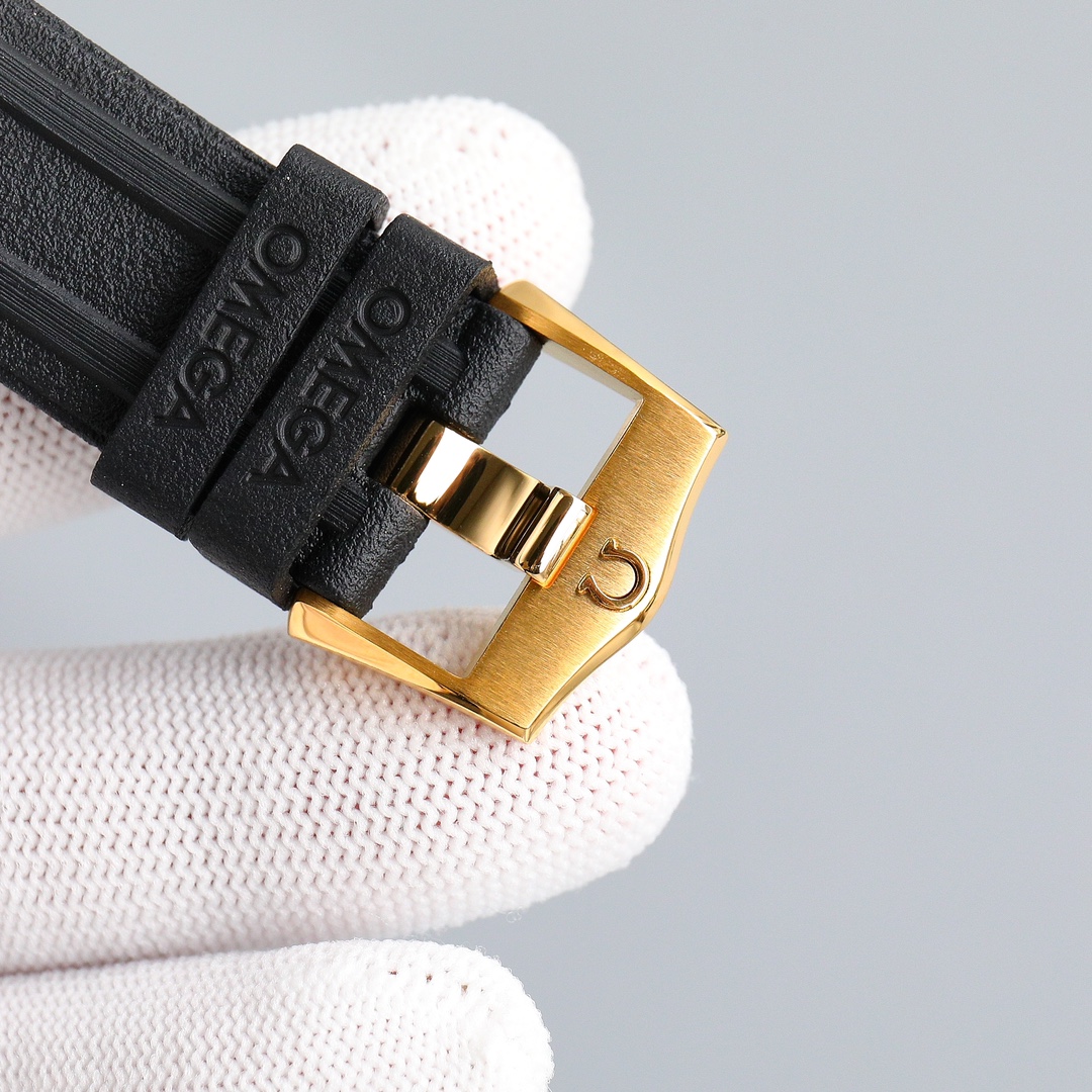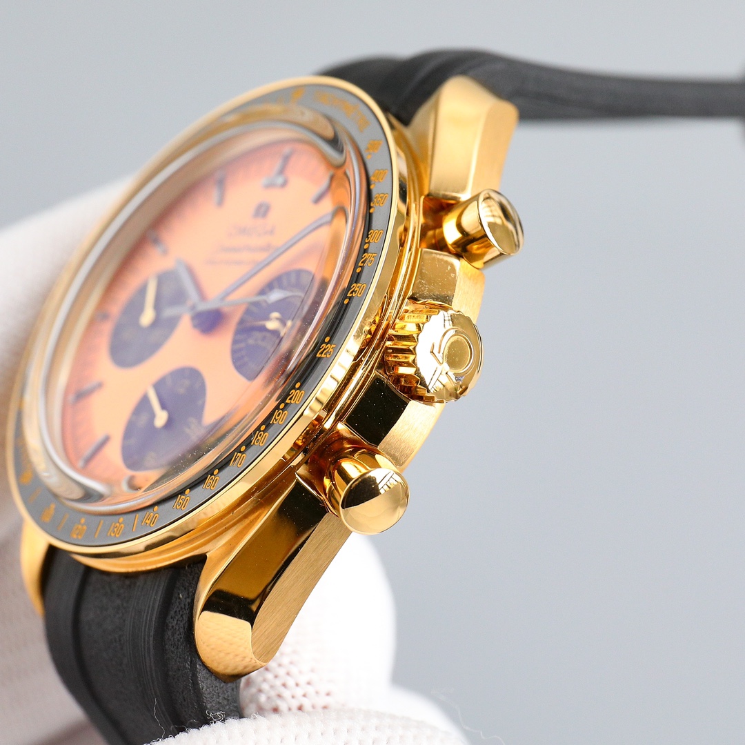 This Moonwatch is inspired by the style of the fourth generation Speedmaster watches. It comes with an integrated black rubber strap and is crafted from Moonshine 18K gold, giving it an elegant and timeless tone. The watch features a Moonshine 18K gold stepped dial with sunray brushed effect, blackened sub-dials and hour markers, a ceramic bezel adorned with a tachymeter scale made using OMEGA Ceragold technology, and the iconic Dot Over Ninety seen on early Speedmaster models, paying tribute to the illustrious lunar landing history of the Speedmaster.