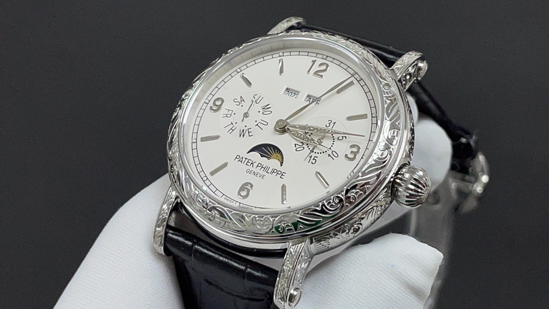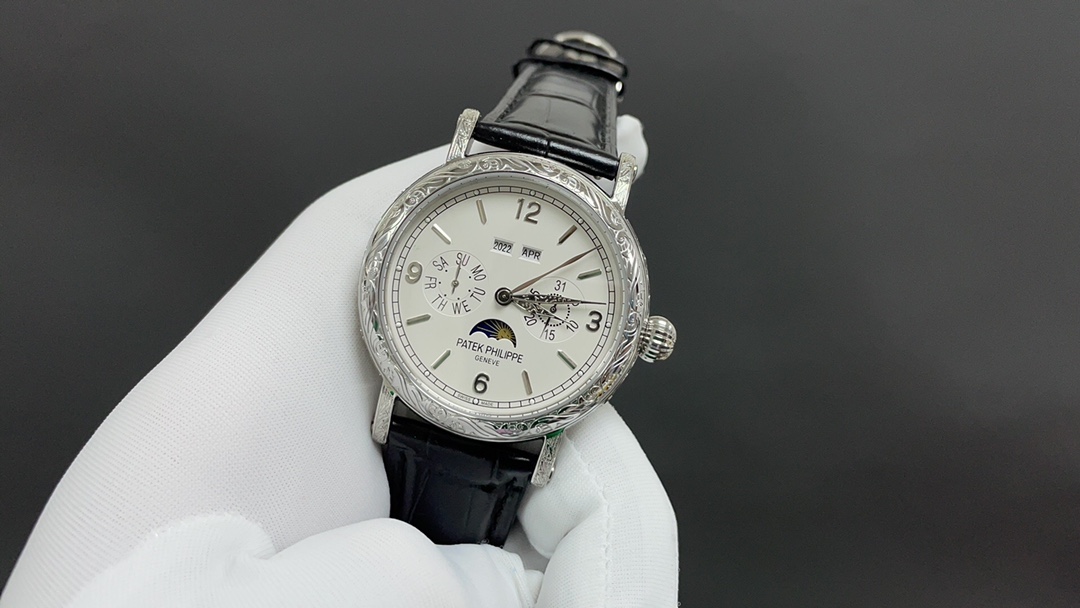 Dial: The dial features minute and second scales along the periphery, with gold Arabic numerals and raised circular hour markers, adding a sense of depth. The hour and minute hands are based on the “Baton” design, with sharp and elongated tips, reminiscent of the hands on the 1950s Ref. 1463 chronograph. The moon phase display and date sub-dial are located at 6 o’clock, and all the indications of the perpetual calendar are easily readable at a glance.
