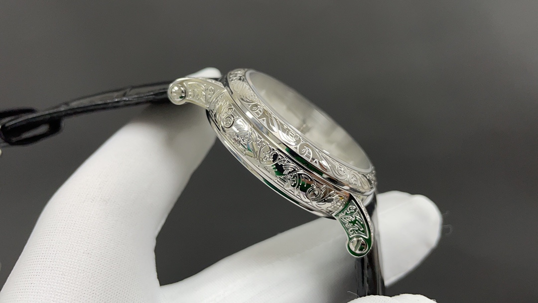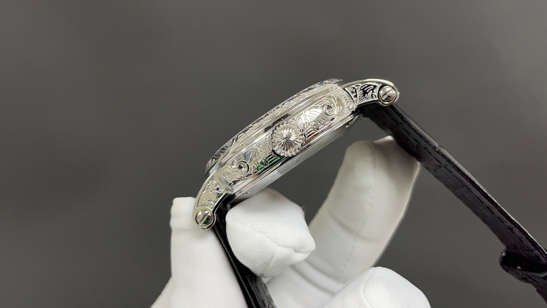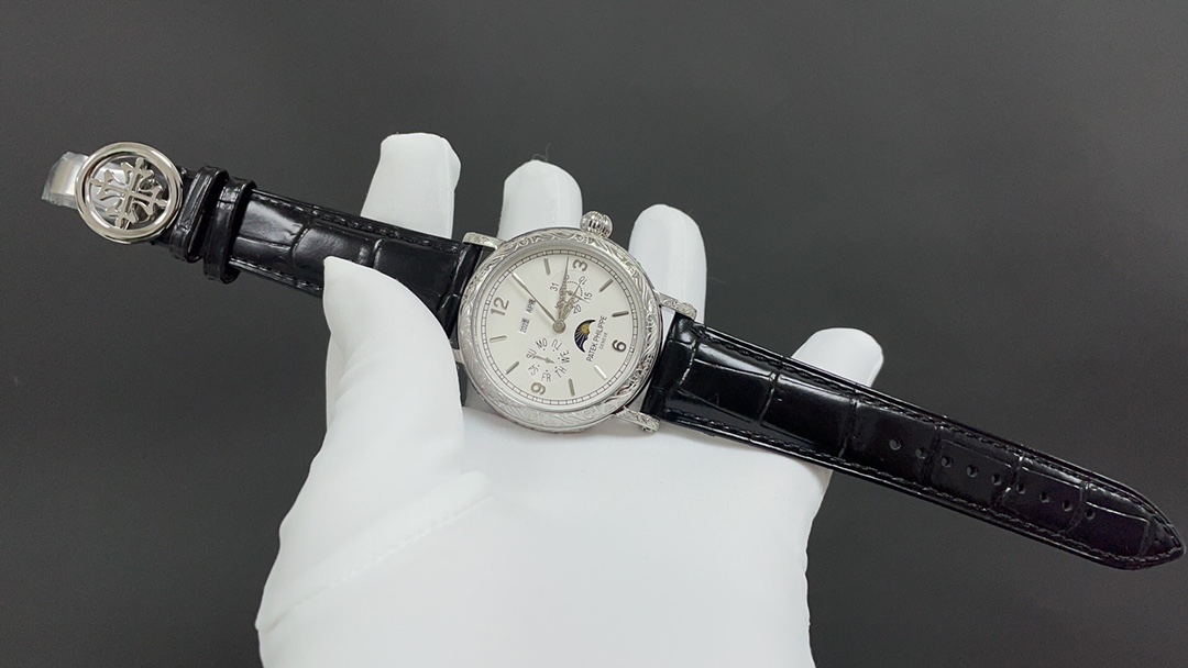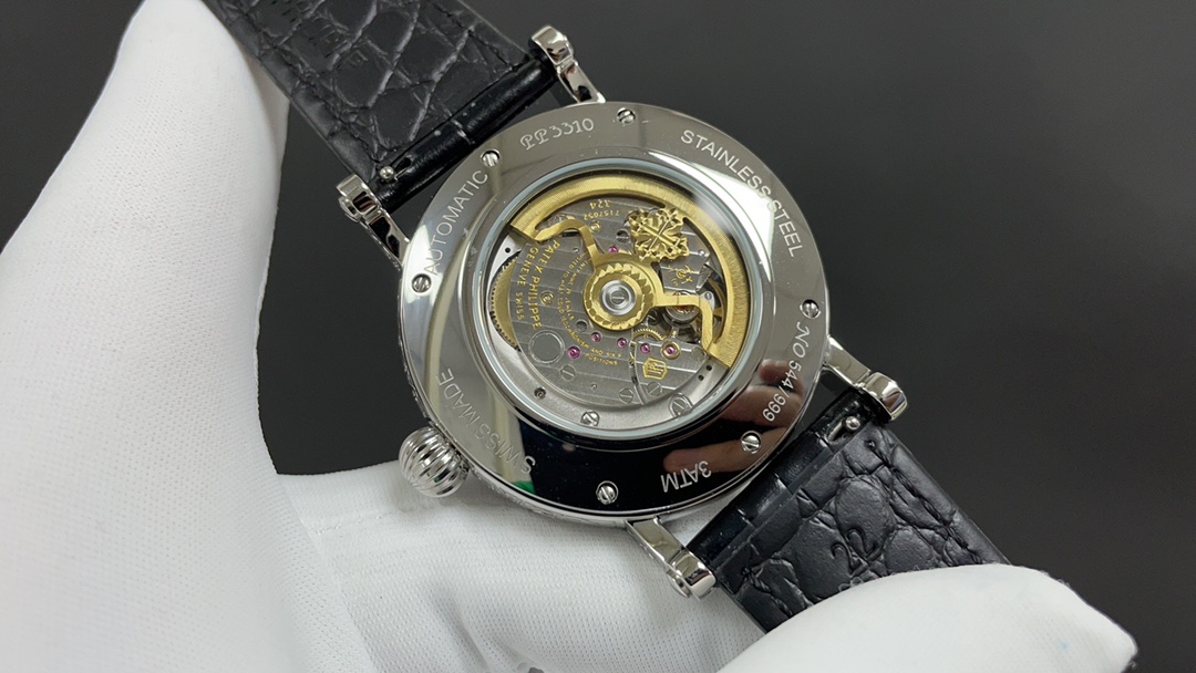 Movement: Equipped with a modified version of the Caliber 324 S Q self-winding movement, which is a refined version of the legendary Caliber 324 automatic movement. The movement features chamfered bridges with finely polished edges, a fish-scale pattern on the main bridge, Geneva waves on the rotor, and gold engraving on the bridge surfaces. The screw slots are also polished and chamfered, and even the holes are treated with the same level of craftsmanship.