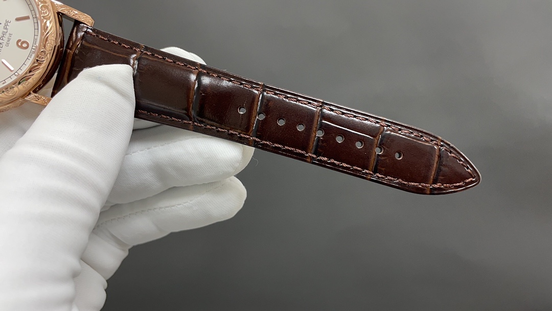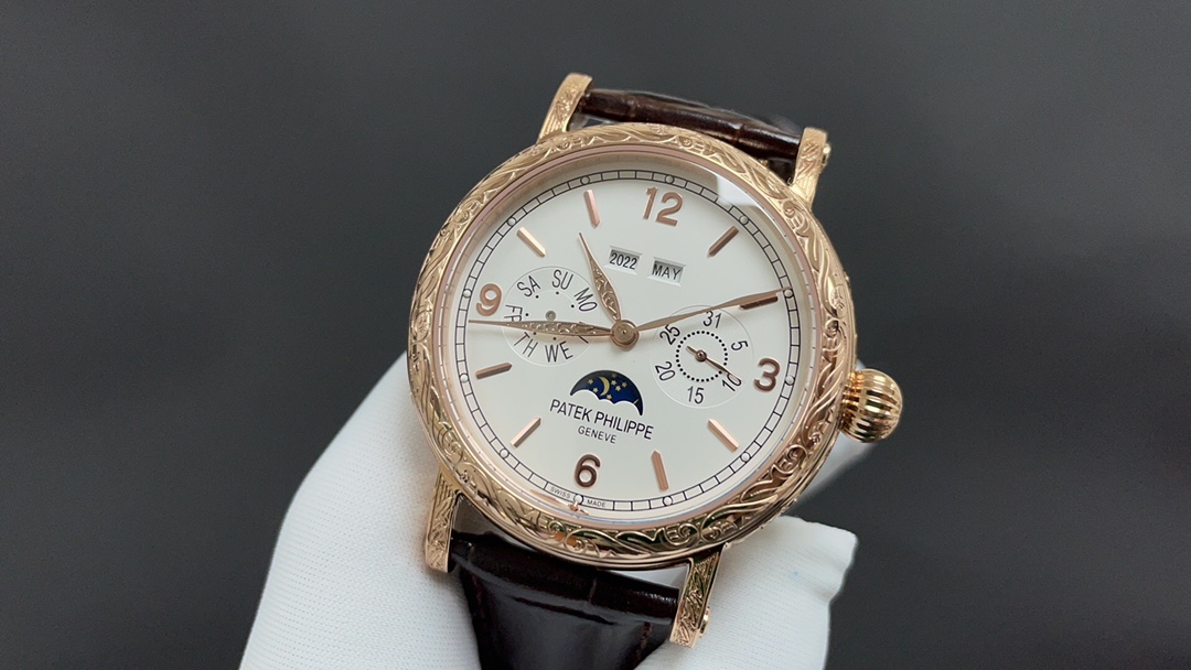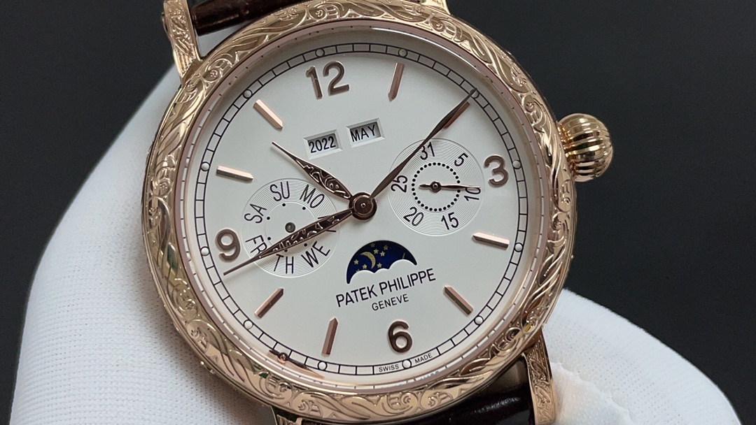 Dial: The dial features minute and second scales along the periphery, with gold Arabic numerals and raised circular hour markers, adding a sense of depth. The hour and minute hands are based on the “Baton” design, with sharp and elongated tips, reminiscent of the hands on the 1950s Ref. 1463 chronograph. The moon phase display and date sub-dial are located at 6 o’clock, and all the indications of the perpetual calendar are easily readable at a glance.