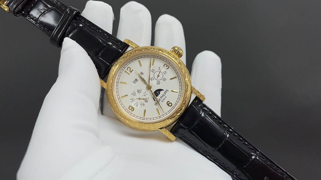 Dial: The dial features minute and second scales along the periphery, with gold Arabic numerals and raised circular hour markers, adding a sense of depth. The hour and minute hands are based on the “Baton” design, with sharp and elongated tips, reminiscent of the hands on the 1950s Ref. 1463 chronograph. The moon phase display and date sub-dial are located at 6 o’clock, and all the indications of the perpetual calendar are easily readable at a glance.