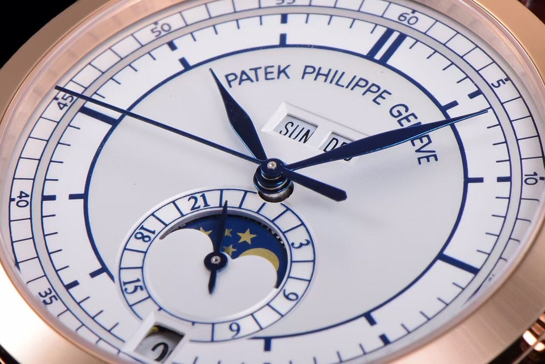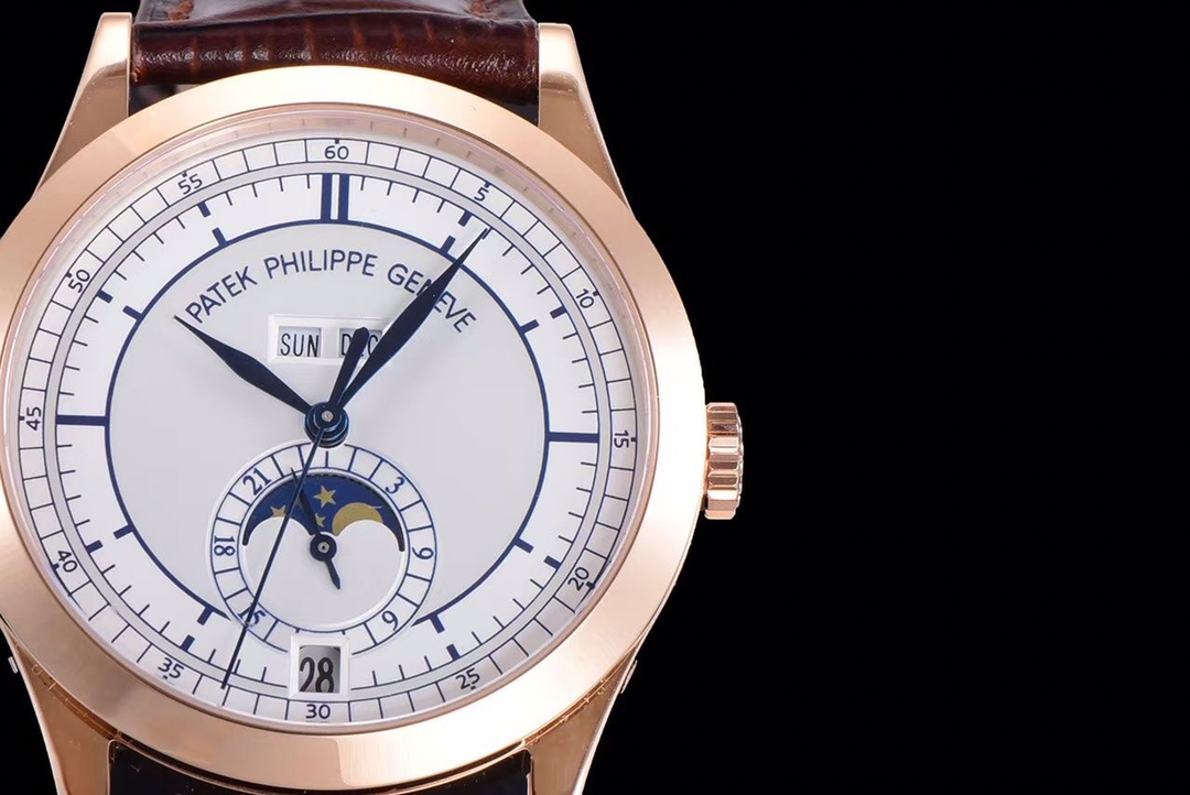 1. Functions: The new generation GR 5396 moon phase disc rotates once a month synchronously with the original. A hidden button at the five o’clock position allows for quick adjustment of the moon phase. The stars and moon on the moon phase disc are sandblasted, just like the original. The crown in the second position can quickly adjust the calendar, and the crown in the third position adjusts the time along with the 24-hour hand. At the twelve o’clock position, there are the weekday and month displays, which can be quickly adjusted using the side buttons at the ten o’clock and three o’clock positions. All functions automatically transition with the passage of time.