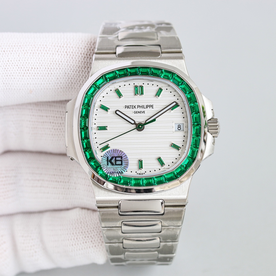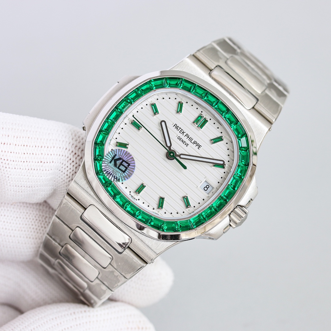 Exquisite diamonds are meticulously set on the case, reflecting a beautiful radiance. The presence of rubies and emeralds enhances the Nautilus’s elegance and sophistication.