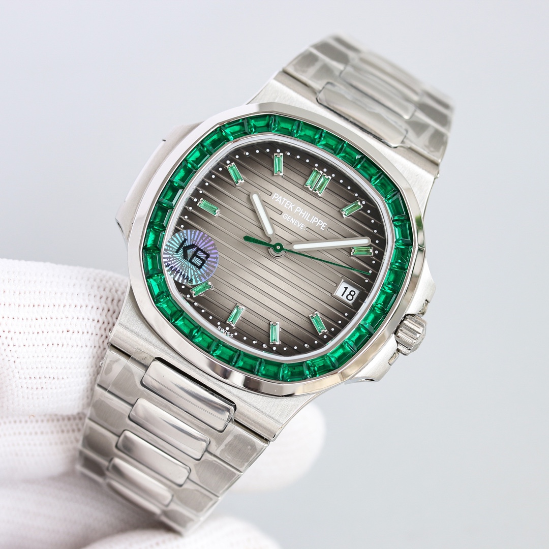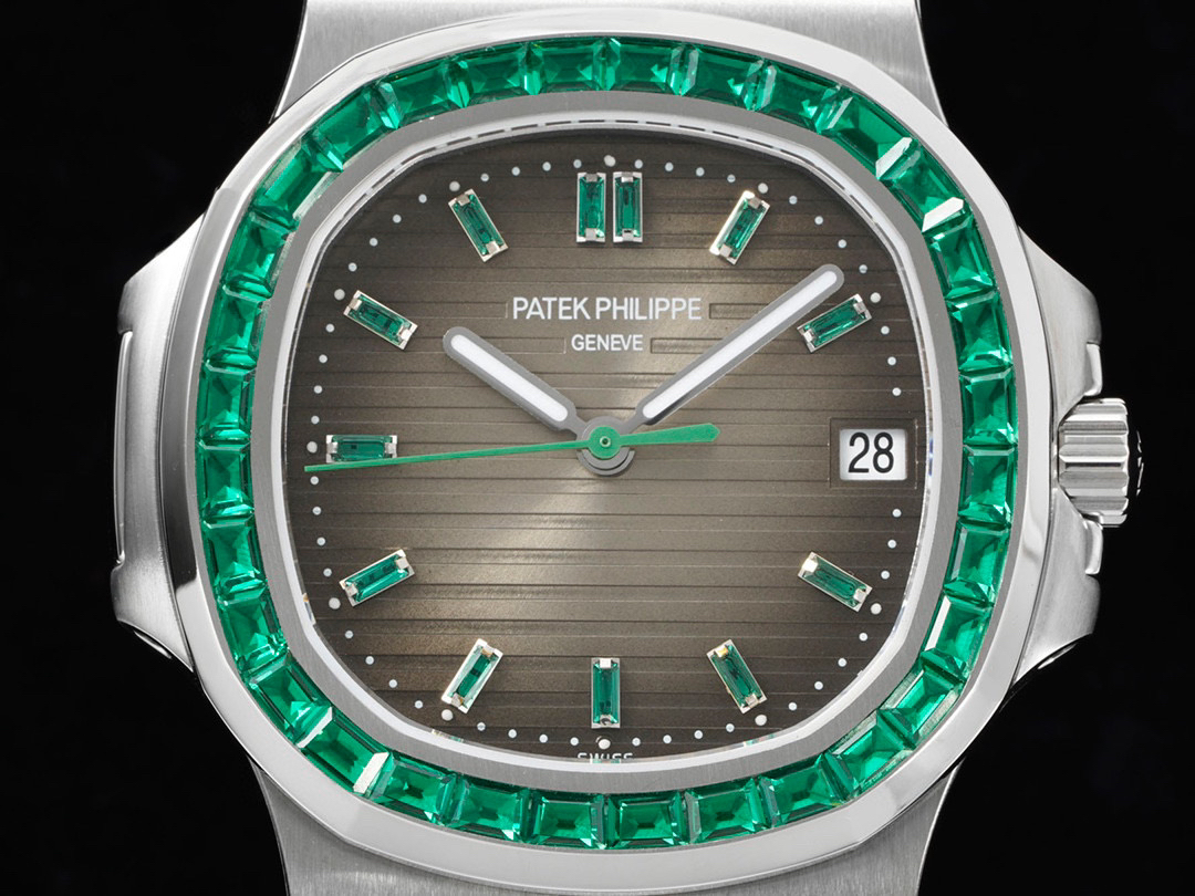 Exquisite diamonds are meticulously set on the case, reflecting a beautiful radiance. The presence of rubies and emeralds enhances the Nautilus’s elegance and sophistication.