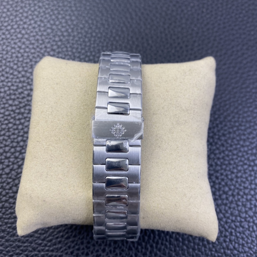 Bracelet: Stainless steel bracelet with hinges developed based on the dismantling of an authentic Patek Philippe Nautilus stainless steel bracelet.