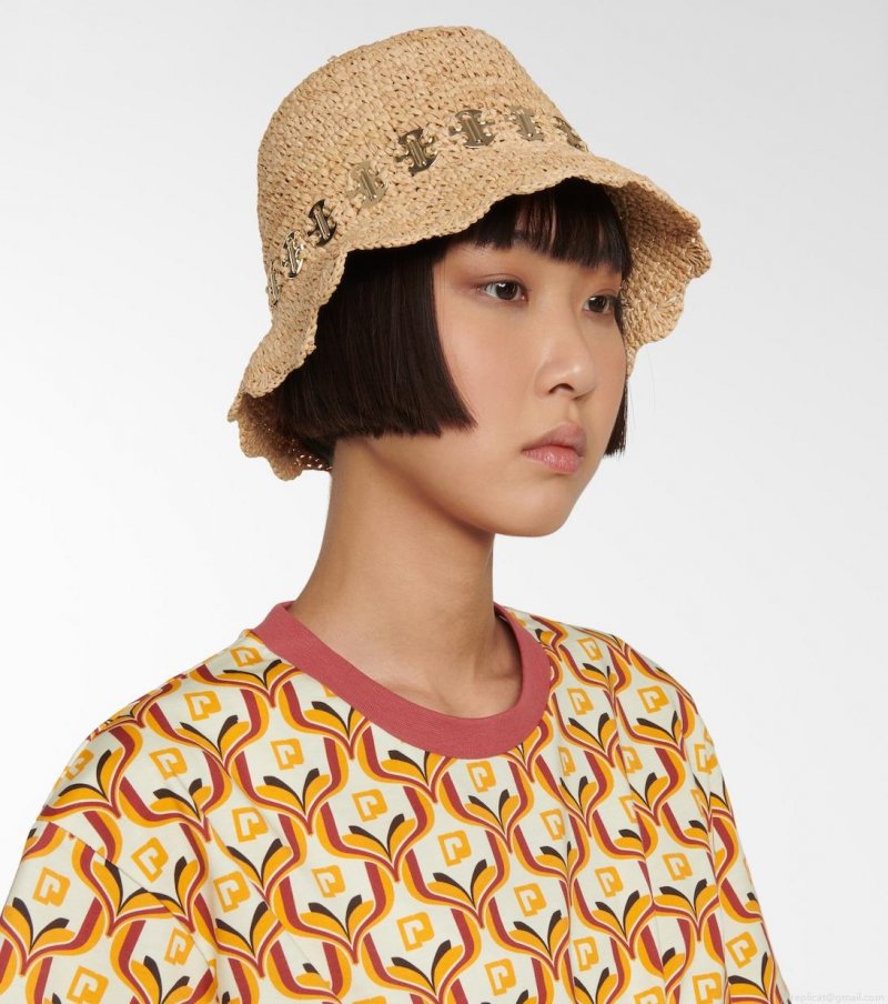 Protect yourself from the sun with this bucket hat from Paco Rabanne. It's made from raffia and embellished with brass discs.