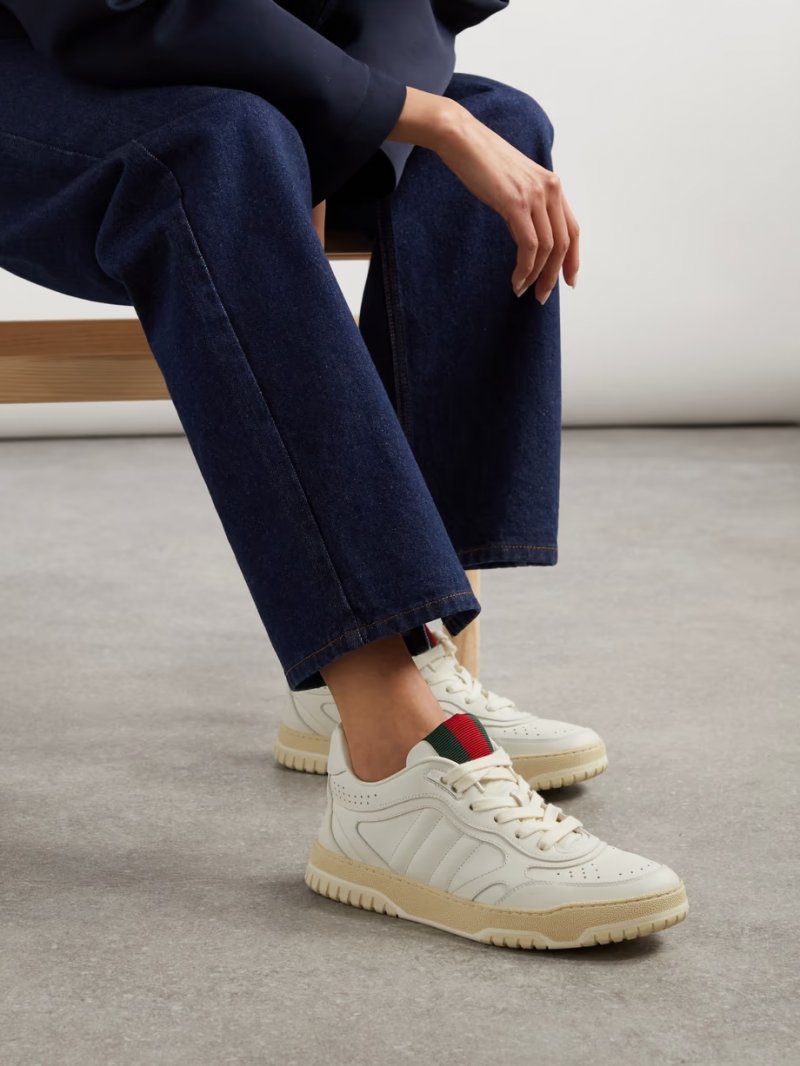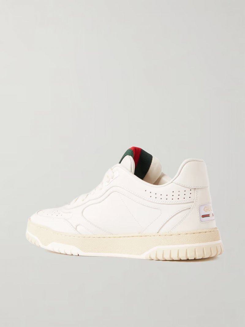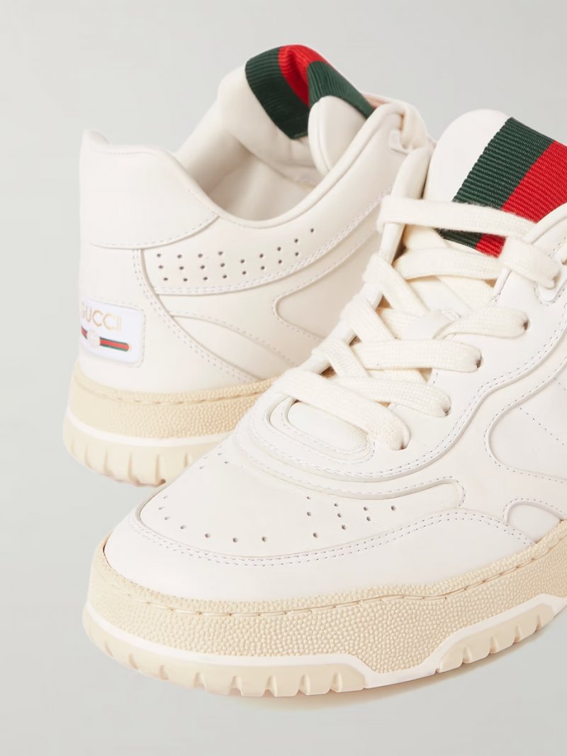 - White leather, red and green grosgrain