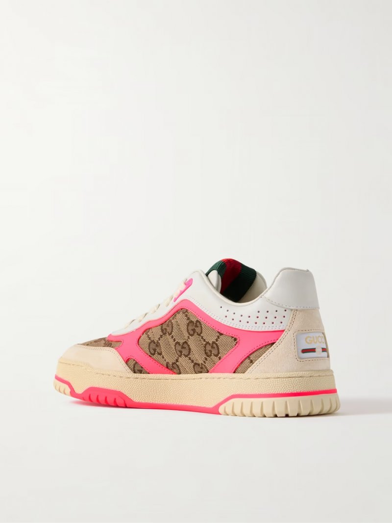 - White and neon-pink leather, cream suede, tonal-brown canvas-jacquard