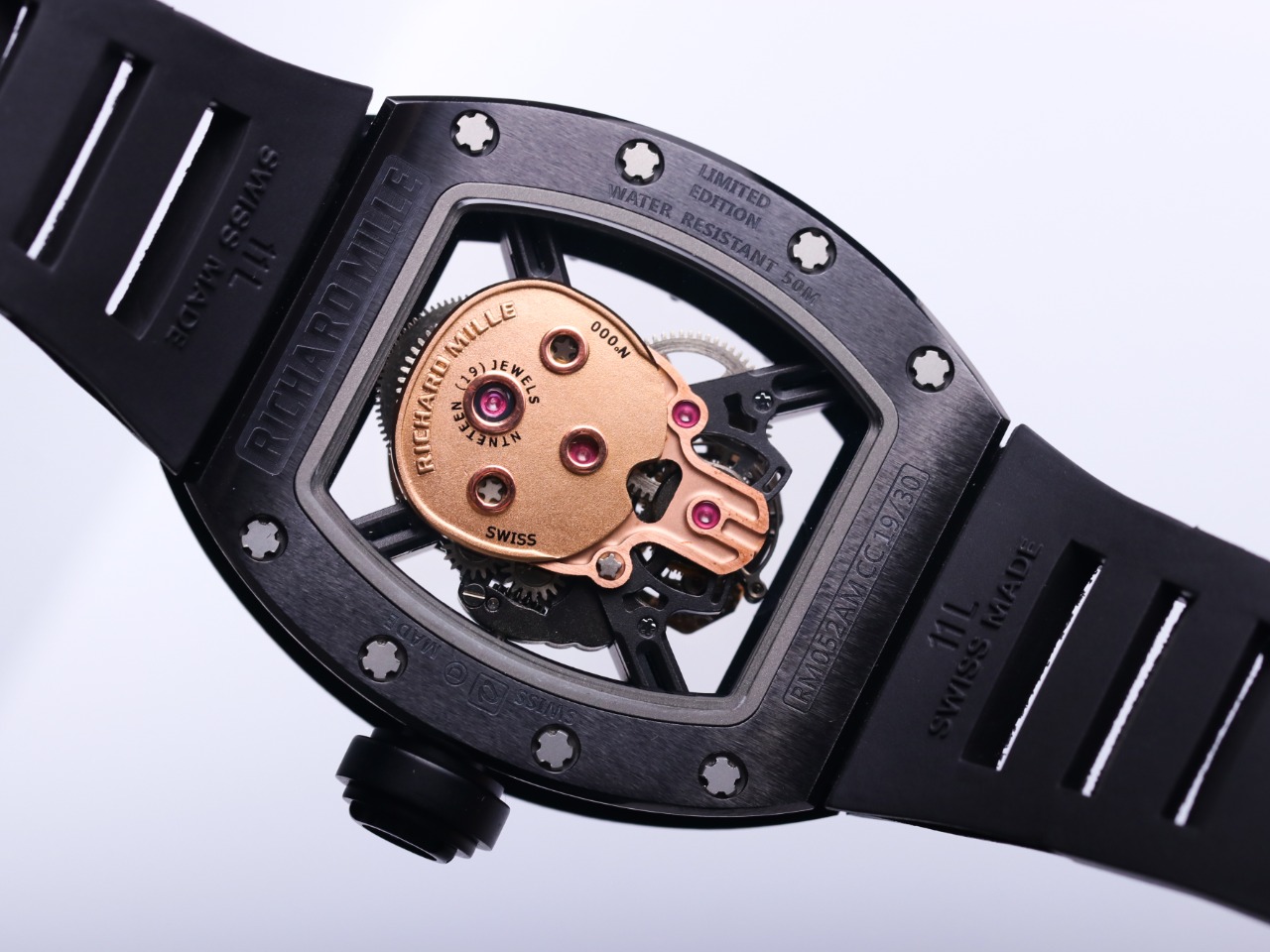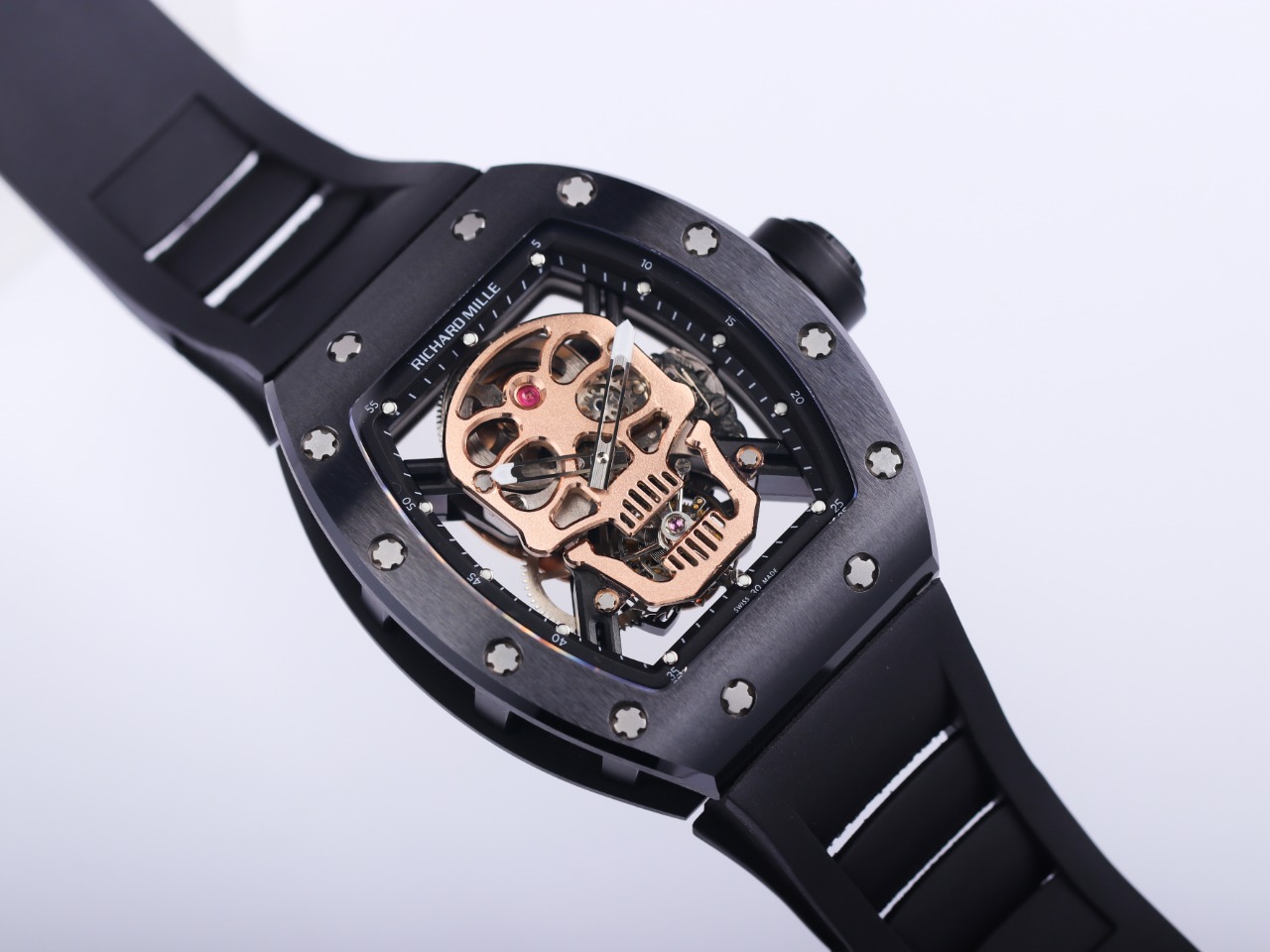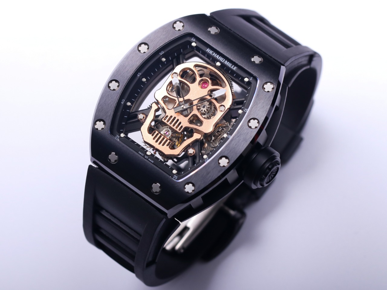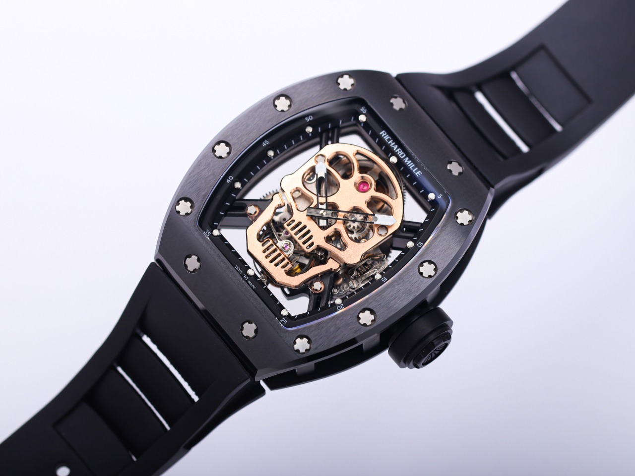The Richard Mille RM52-01 Tourbillon Skull watch reinterprets the essence of the RICHARD MILLE skull, surpassing multiple versions and allowing avid fans to own a highly accurate replica with precise dimensions, movement, and details. The left inner wall of the case is engraved with the RM052 logo, just like the original, and the size and depth of the right eye gear are similar to the original.