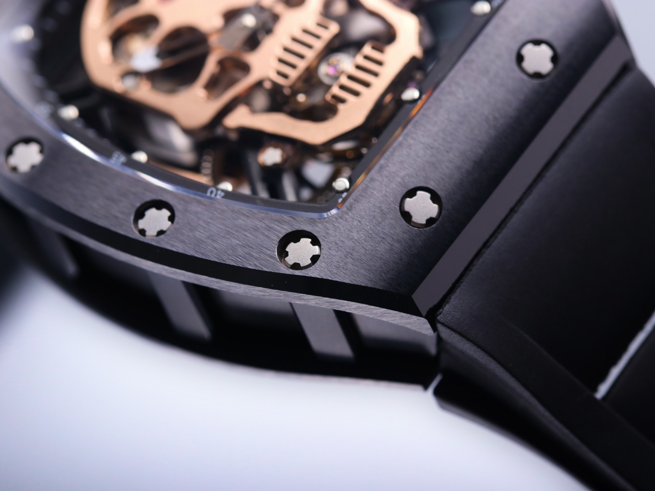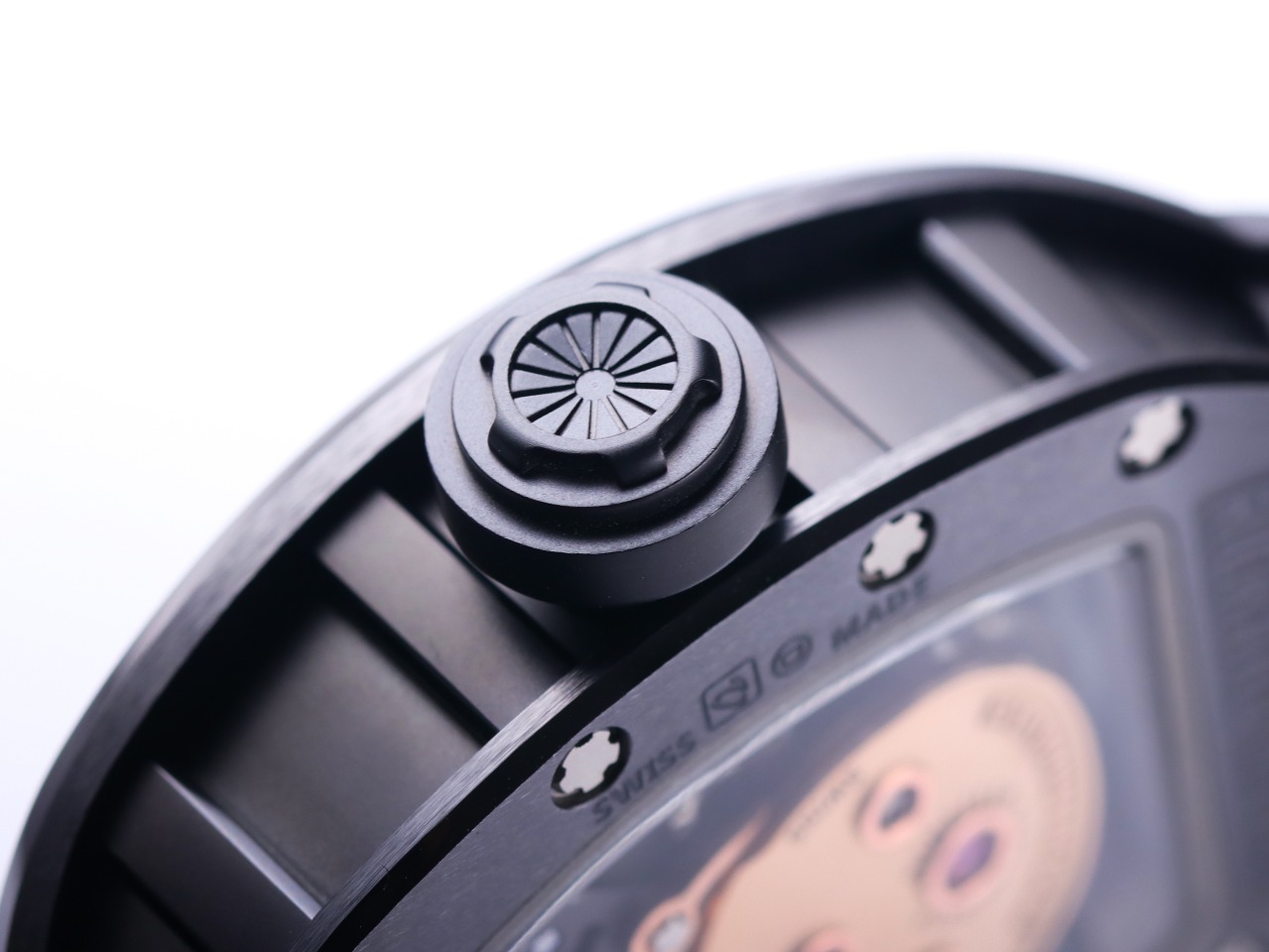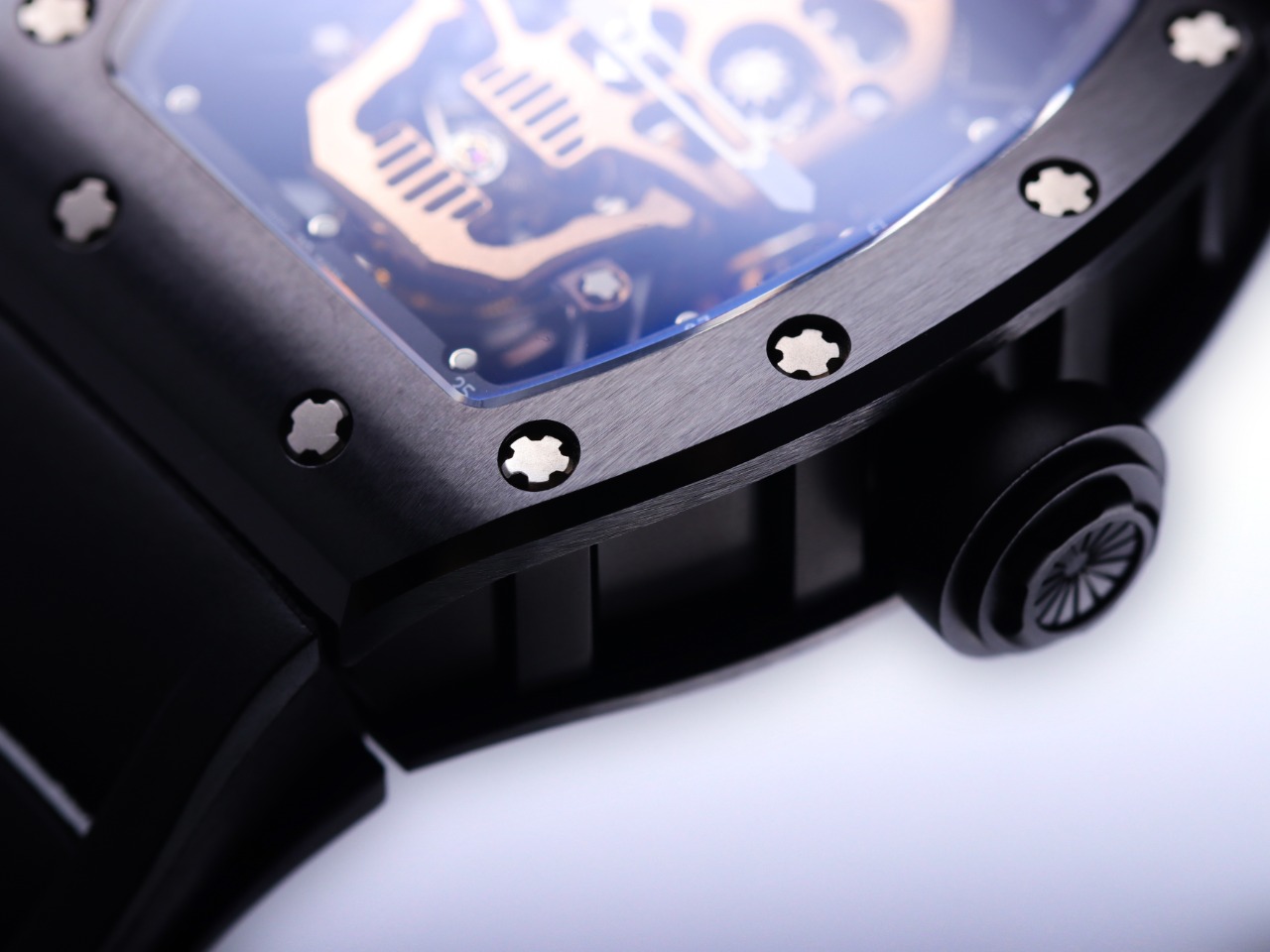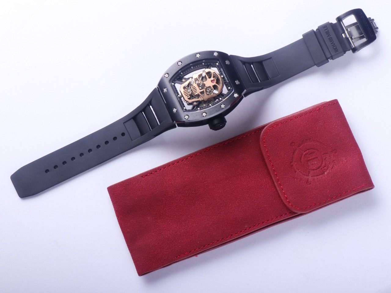 The Richard Mille RM52-01 Tourbillon Skull watch reinterprets the essence of the RICHARD MILLE skull, surpassing multiple versions and allowing avid fans to own a highly accurate replica with precise dimensions, movement, and details. The left inner wall of the case is engraved with the RM052 logo, just like the original, and the size and depth of the right eye gear are similar to the original.
