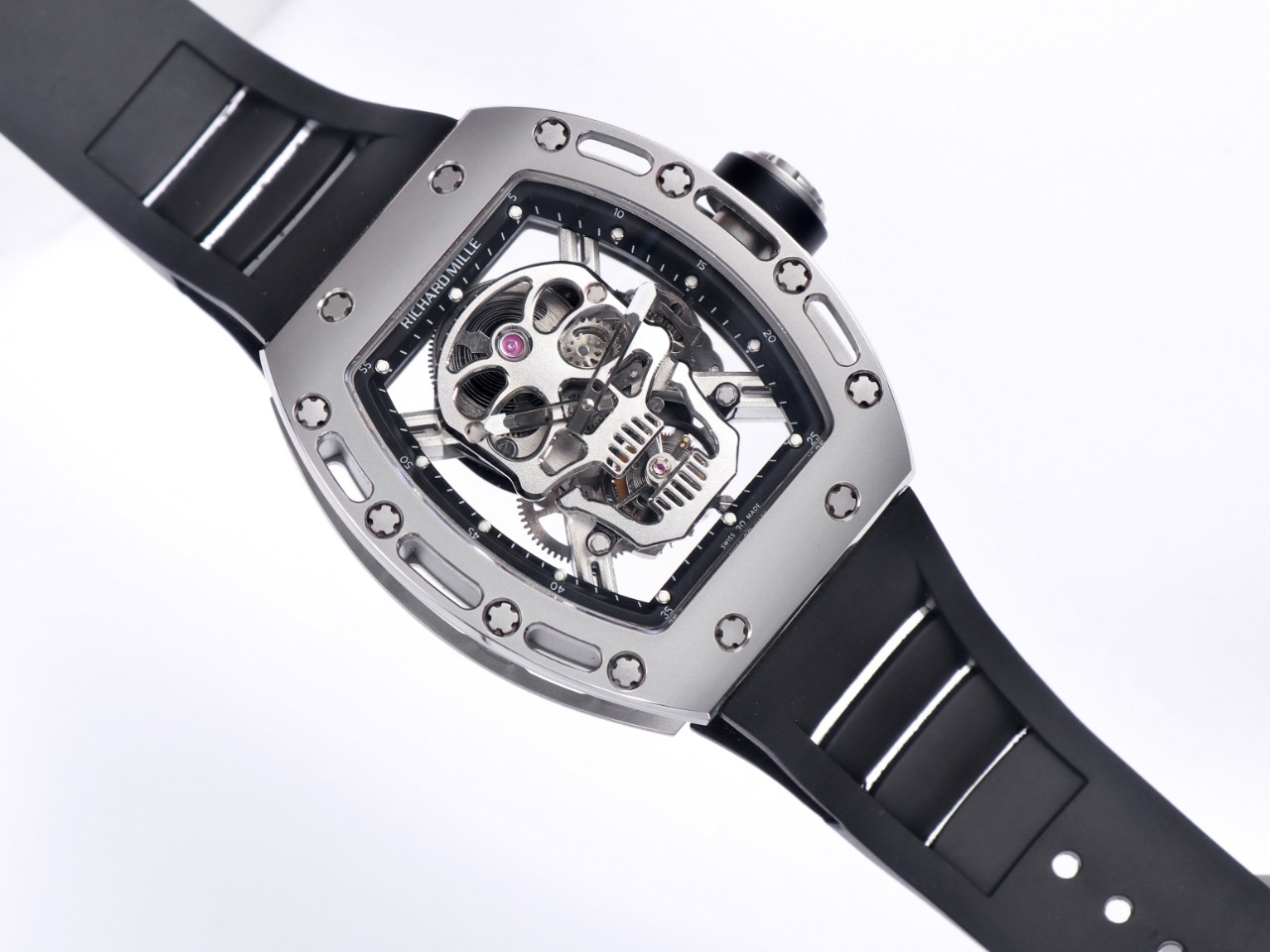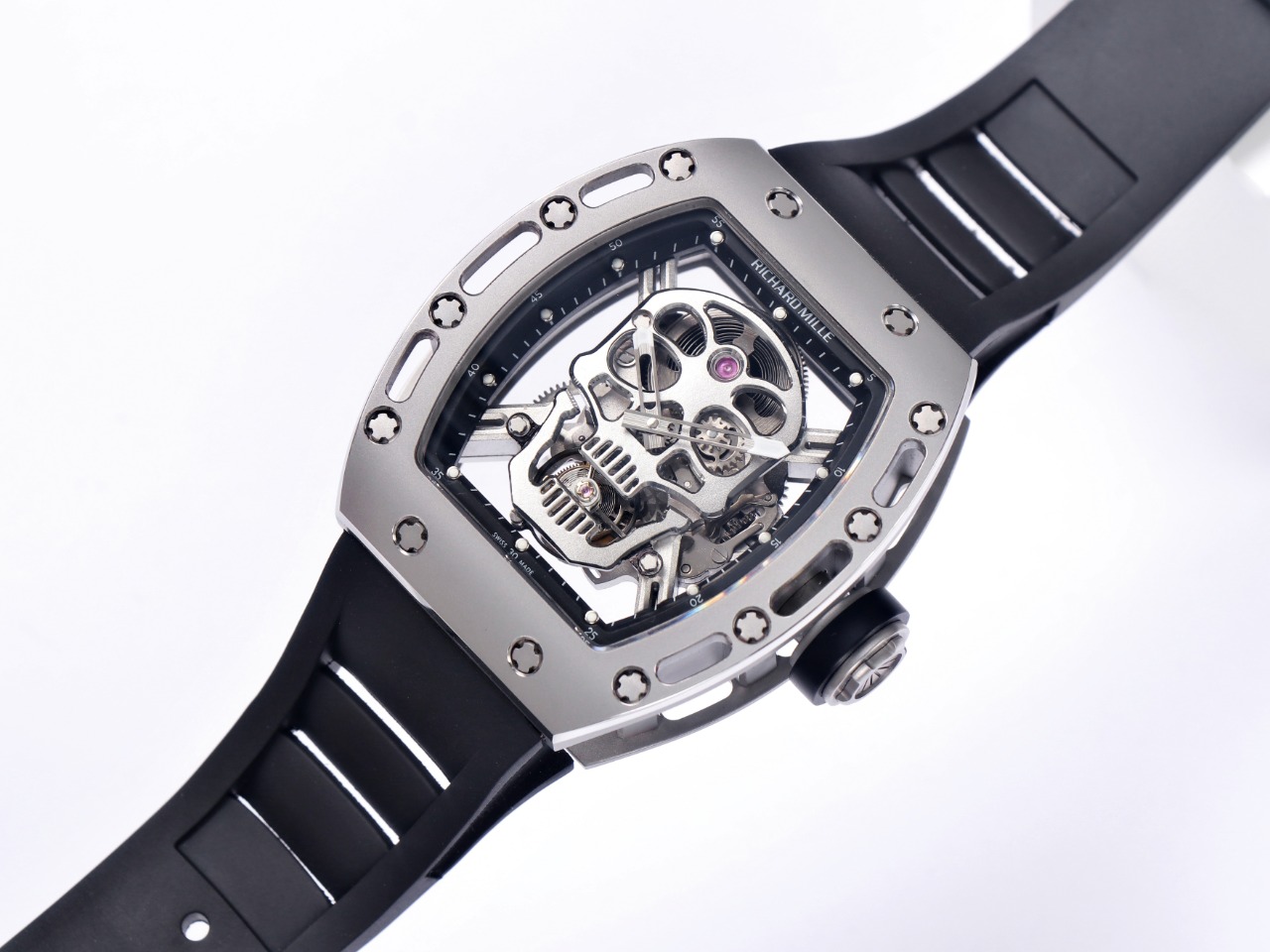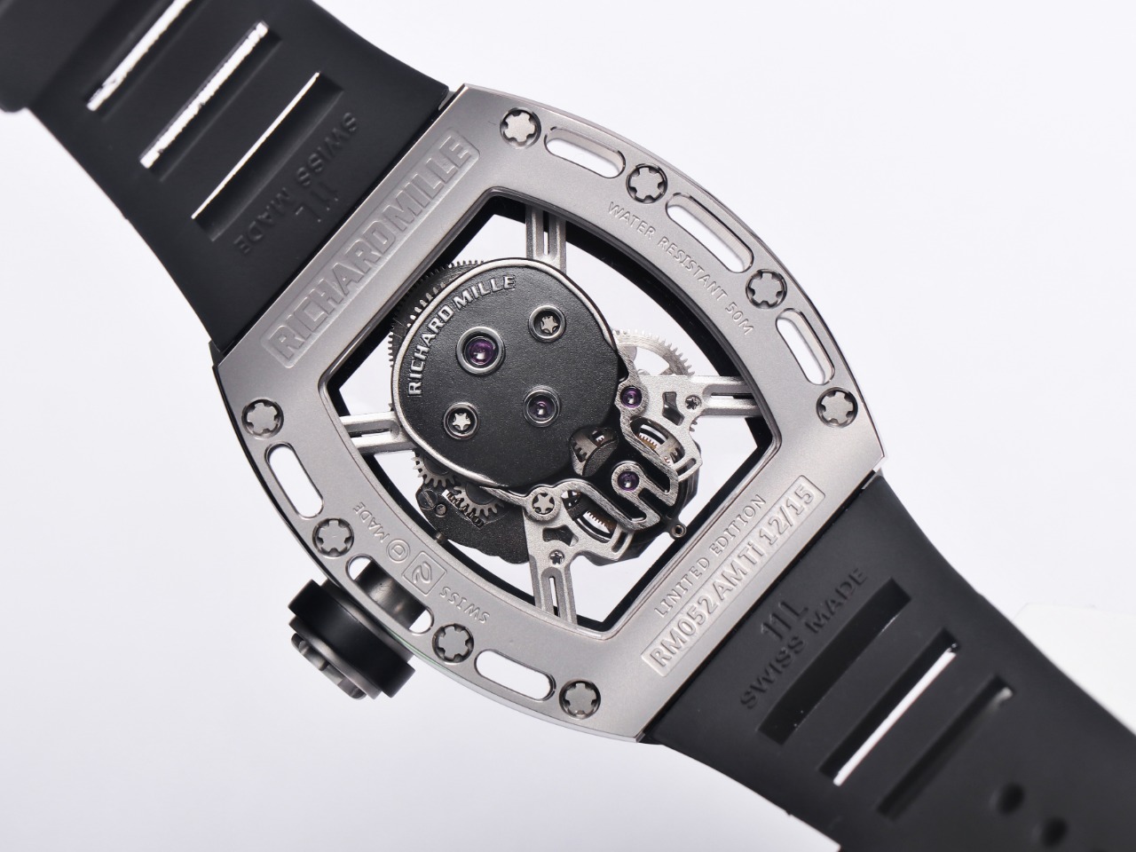 The Richard Mille RM52-01 Tourbillon Skull watch reinterprets the essence of the RICHARD MILLE skull, surpassing multiple versions and allowing avid fans to own a highly accurate replica with precise dimensions, movement, and details. The left inner wall of the case is engraved with the RM052 logo, just like the original, and the size and depth of the right eye gear are similar to the original.