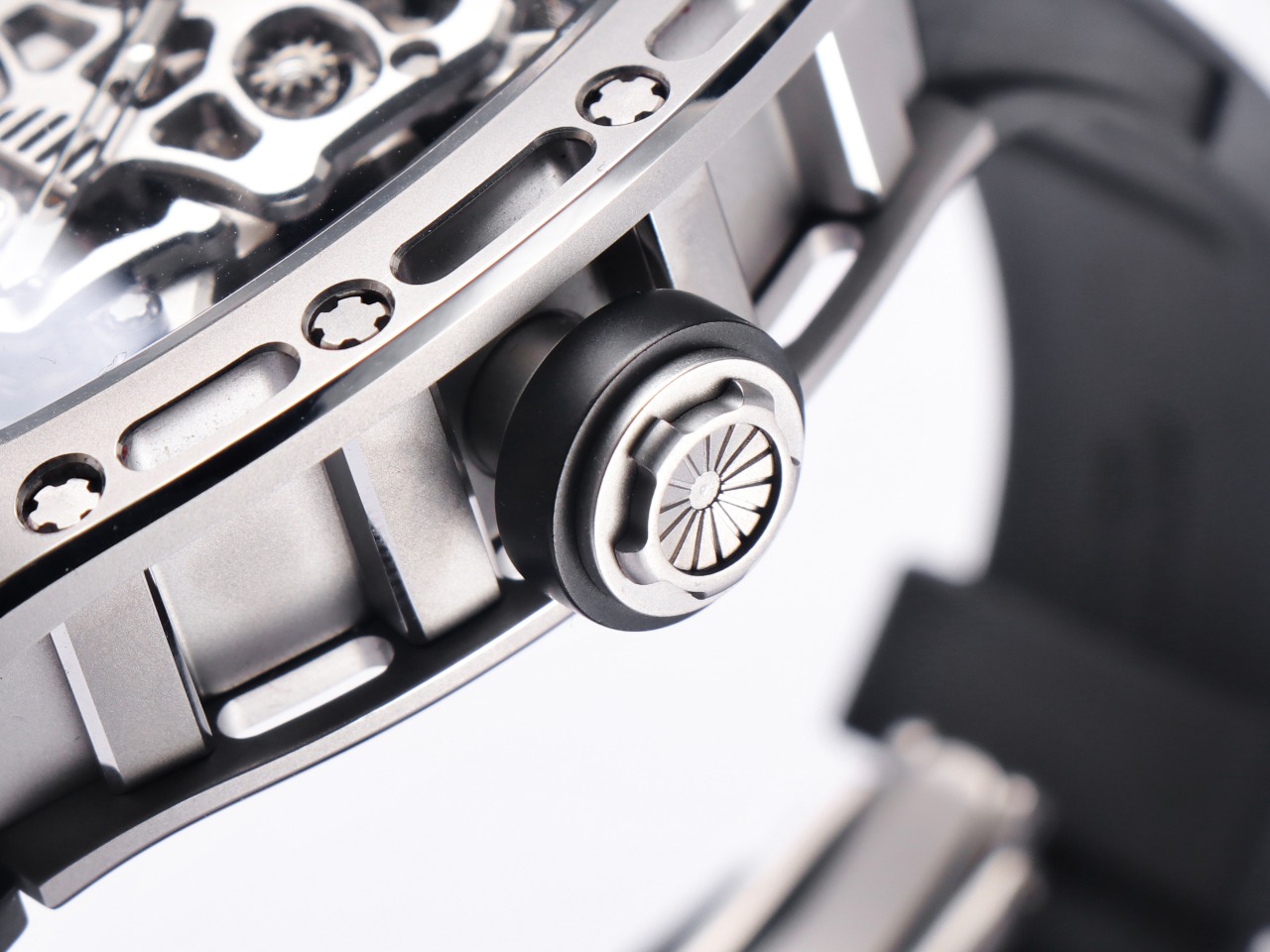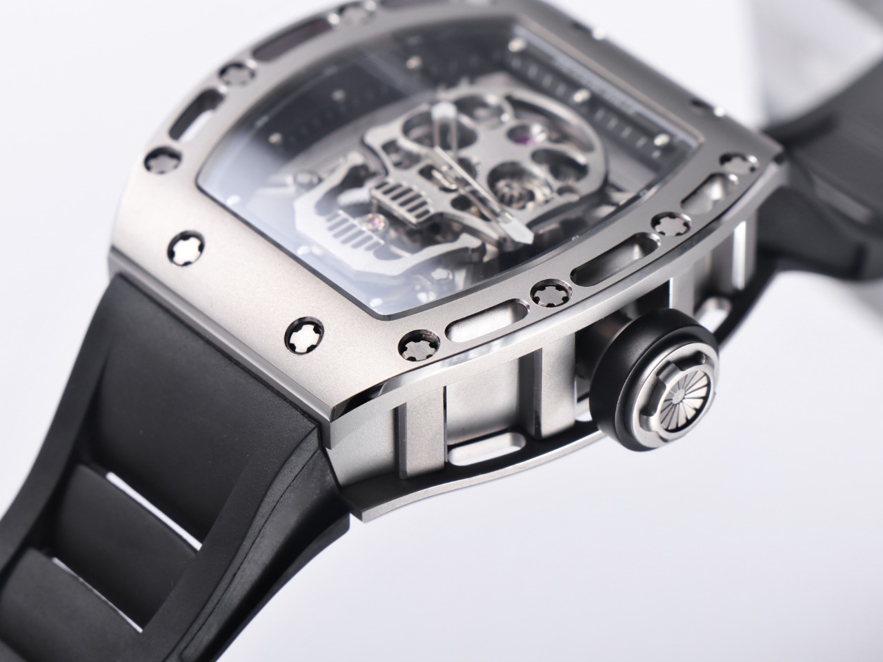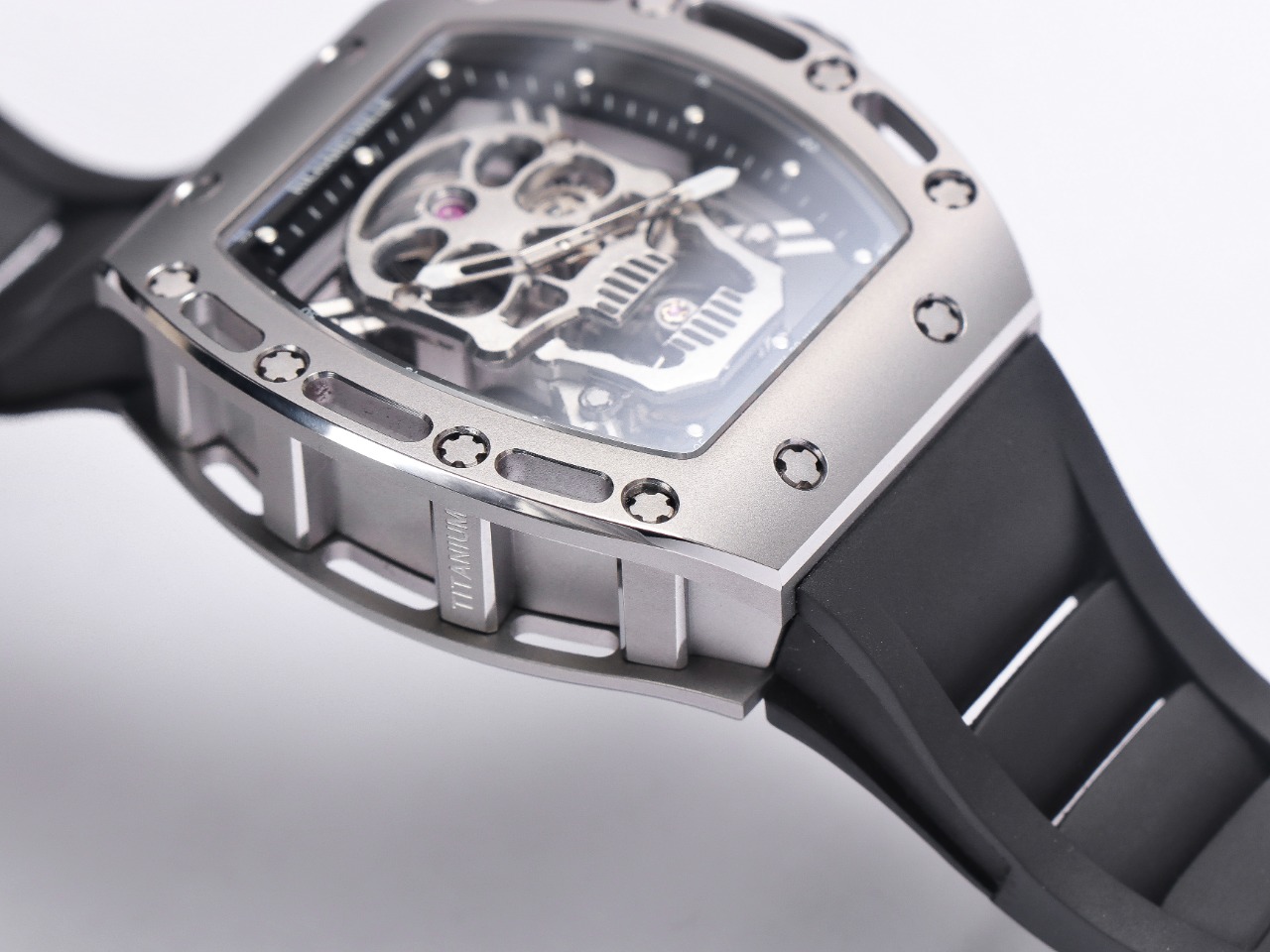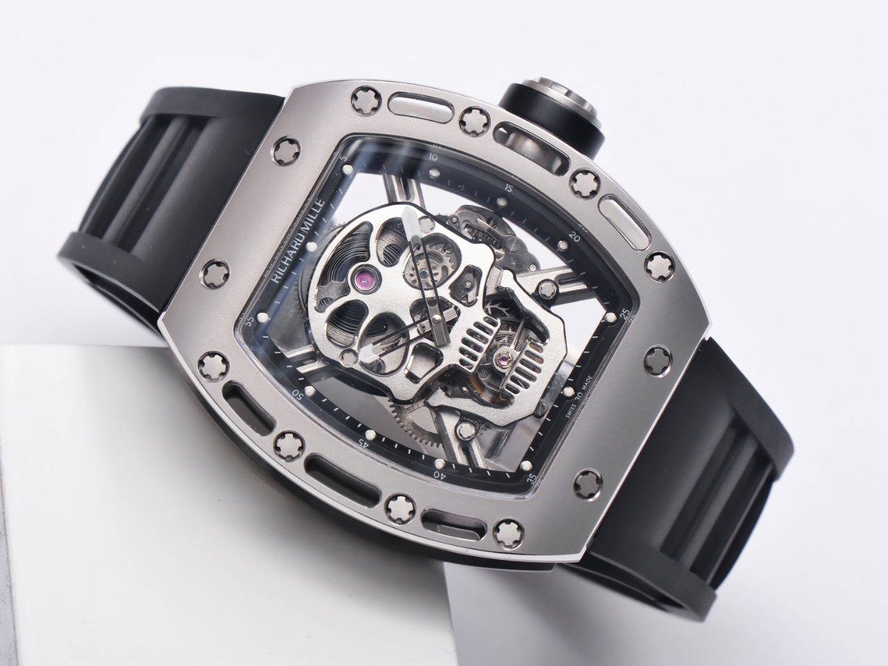 The Richard Mille RM52-01 Tourbillon Skull watch reinterprets the essence of the RICHARD MILLE skull, surpassing multiple versions and allowing avid fans to own a highly accurate replica with precise dimensions, movement, and details. The left inner wall of the case is engraved with the RM052 logo, just like the original, and the size and depth of the right eye gear are similar to the original.