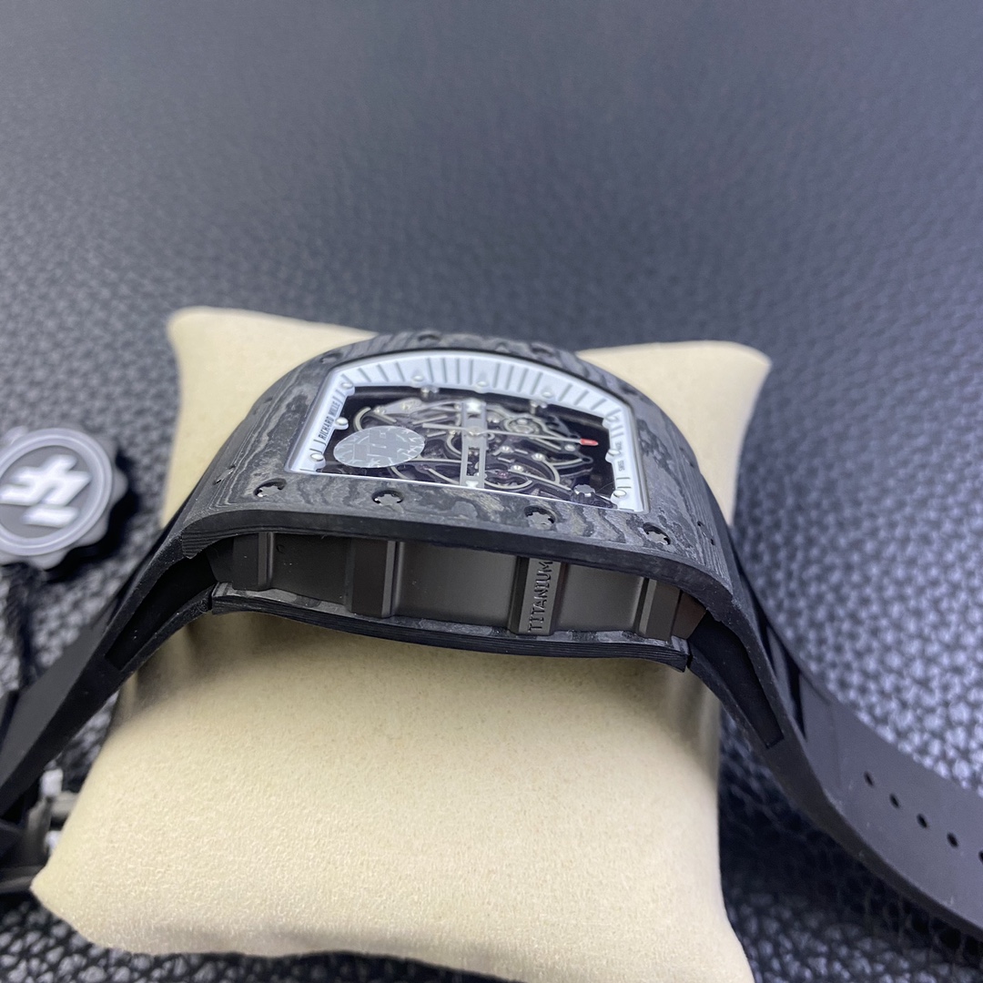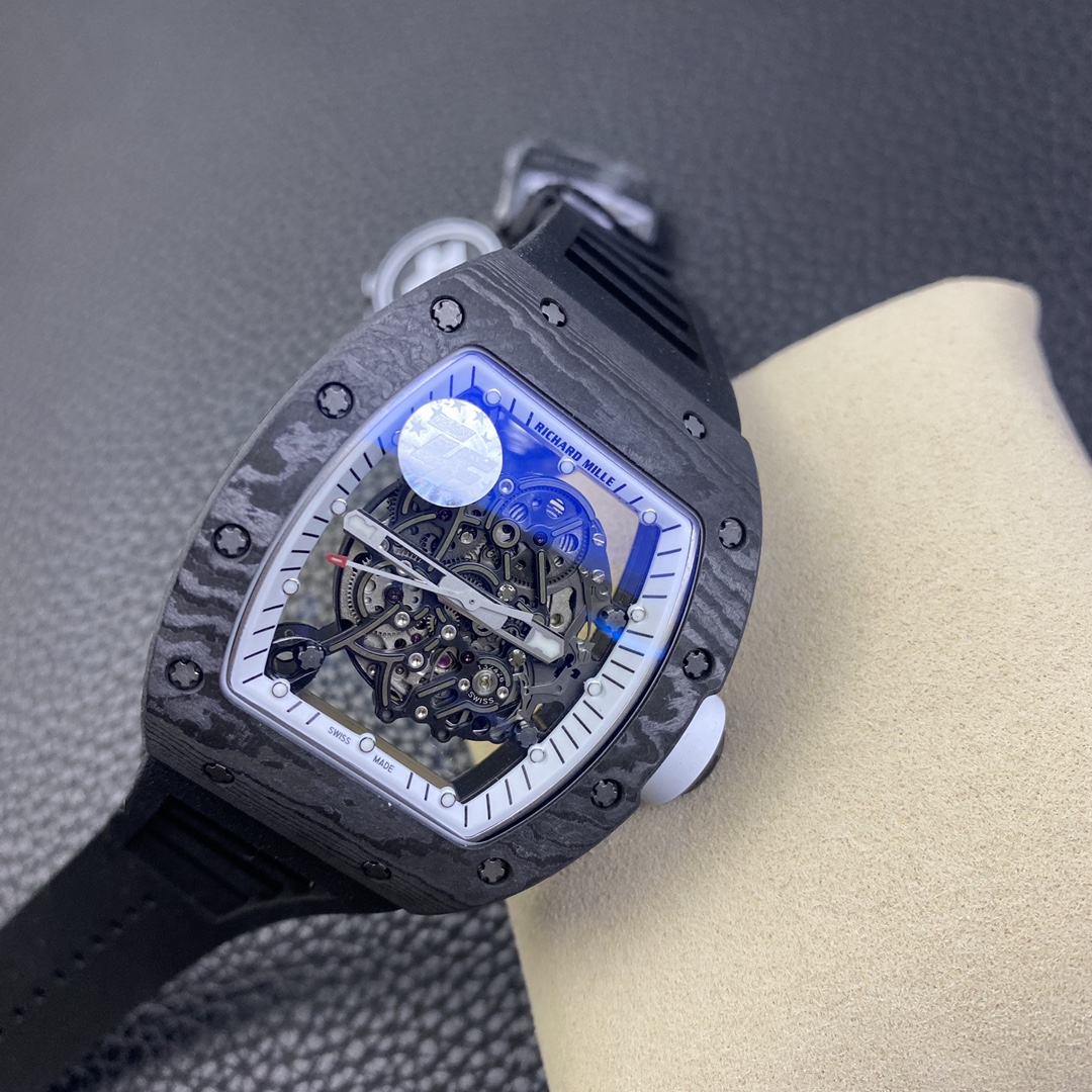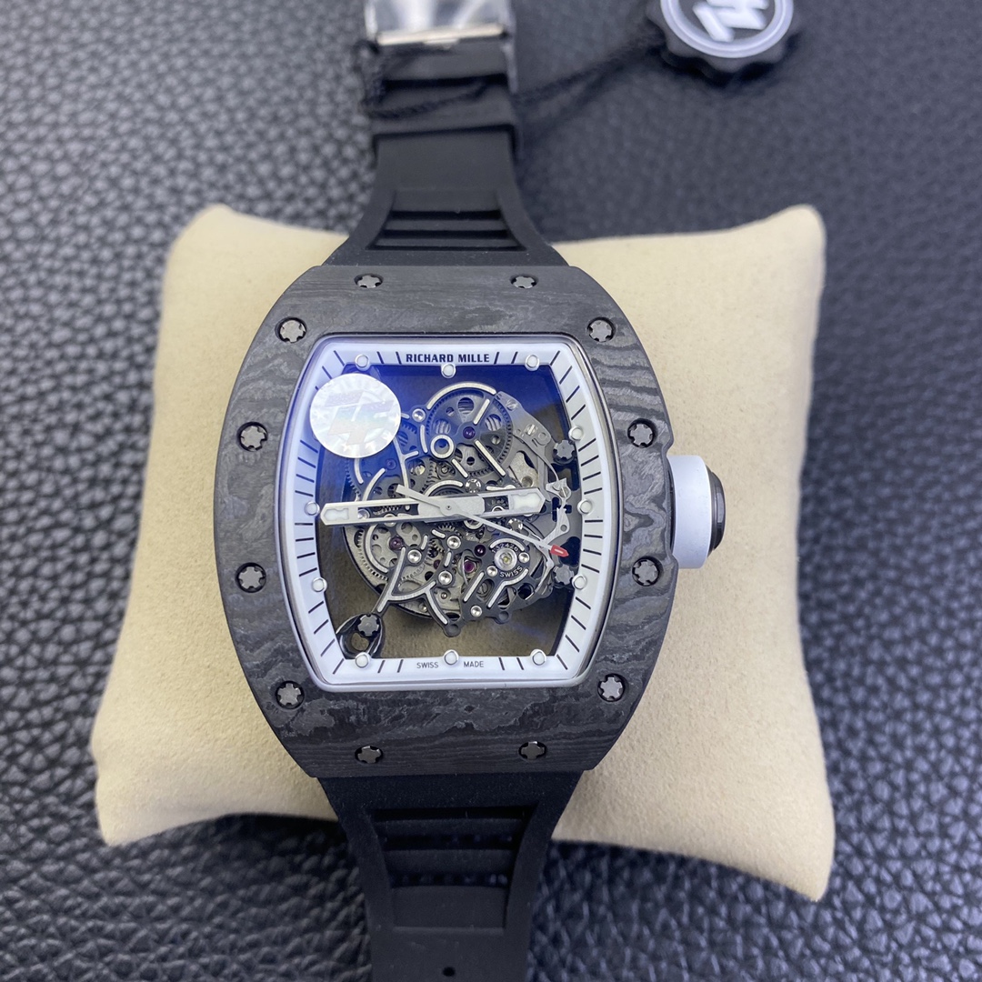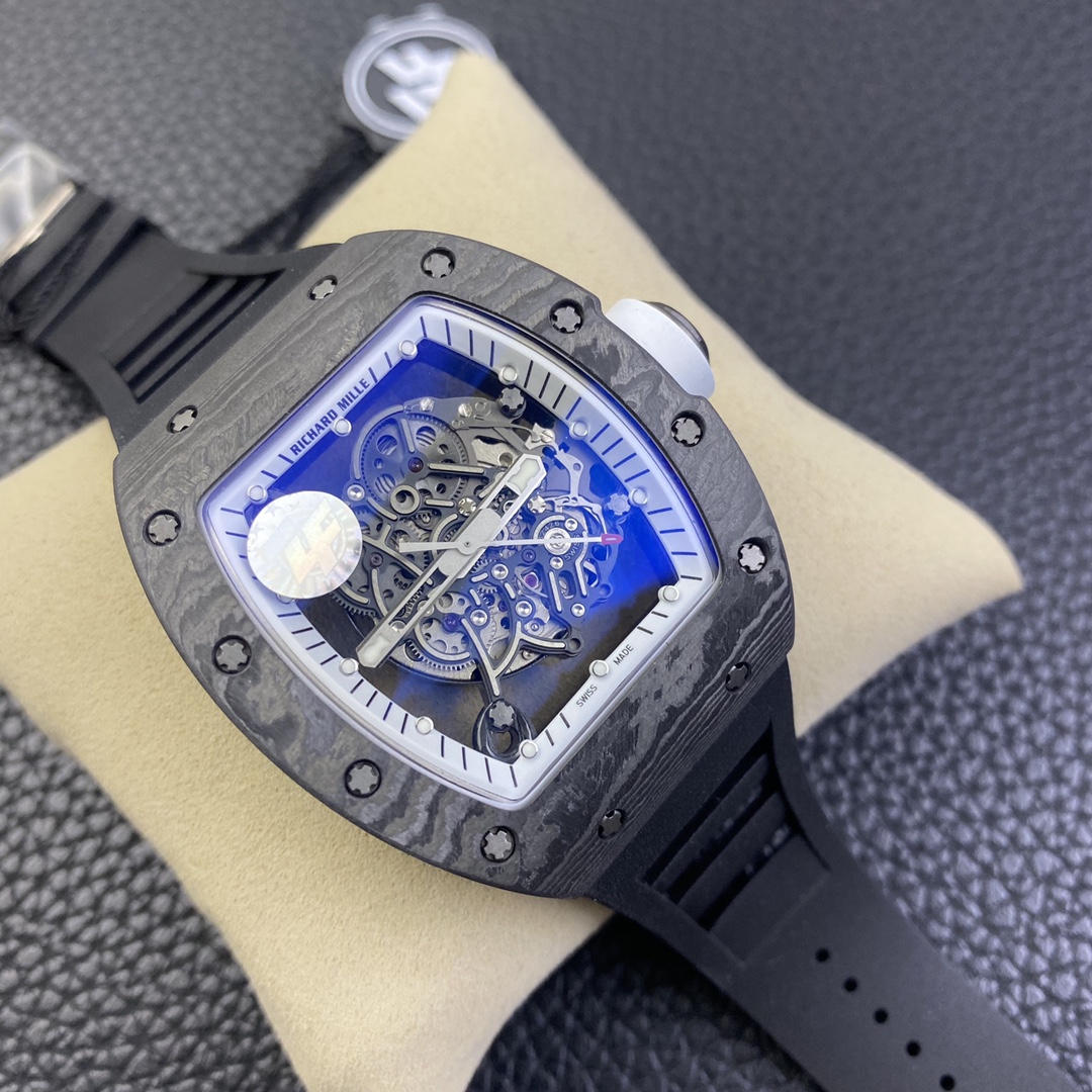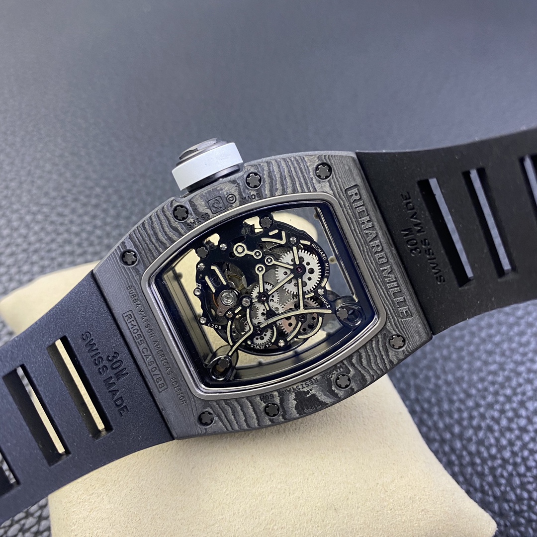 The Richard Mille RM055 Carbon Fiber Limited Edition watch delivers an ultimate visual impact. Richard Mille not only showcases exquisite watchmaking craftsmanship and remains true to the spirit of traditional watches but also advocates breaking through existing boundaries and exploring new heights in watchmaking. It seamlessly incorporates new elements of the new century into traditional craftsmanship, making comfortable, shock-resistant, durable, precise, and lightweight watches a top brand in the watch industry.