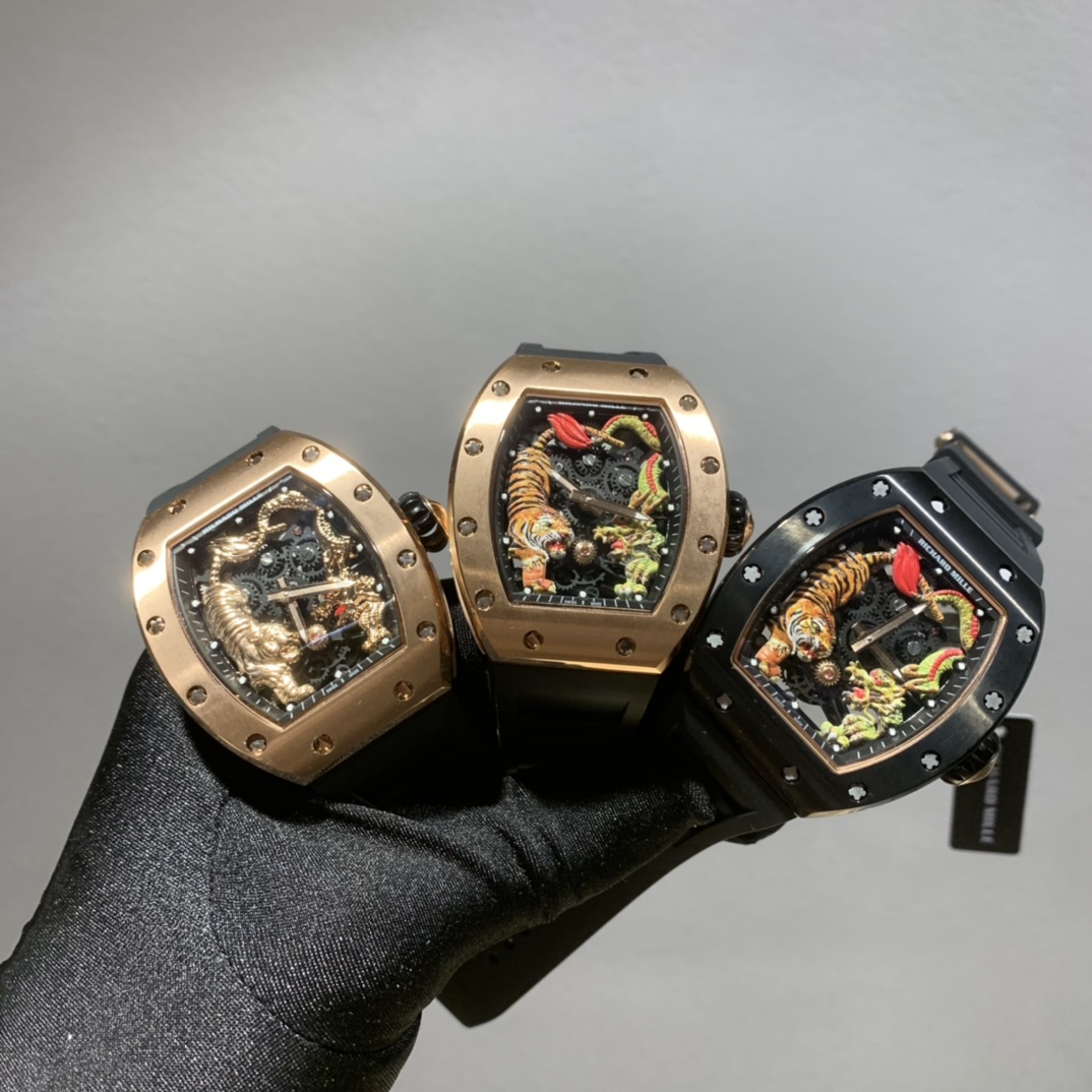 The RM51-01 “Tiger and Dragon Battle” watch is a hand-painted artistic masterpiece featuring vibrant colors and lifelike depictions of a tiger and a dragon intertwined around the movement. The tiger represents power and courage, while the dragon symbolizes prosperity and happiness, making it a highly coveted timepiece with profound symbolic significance.