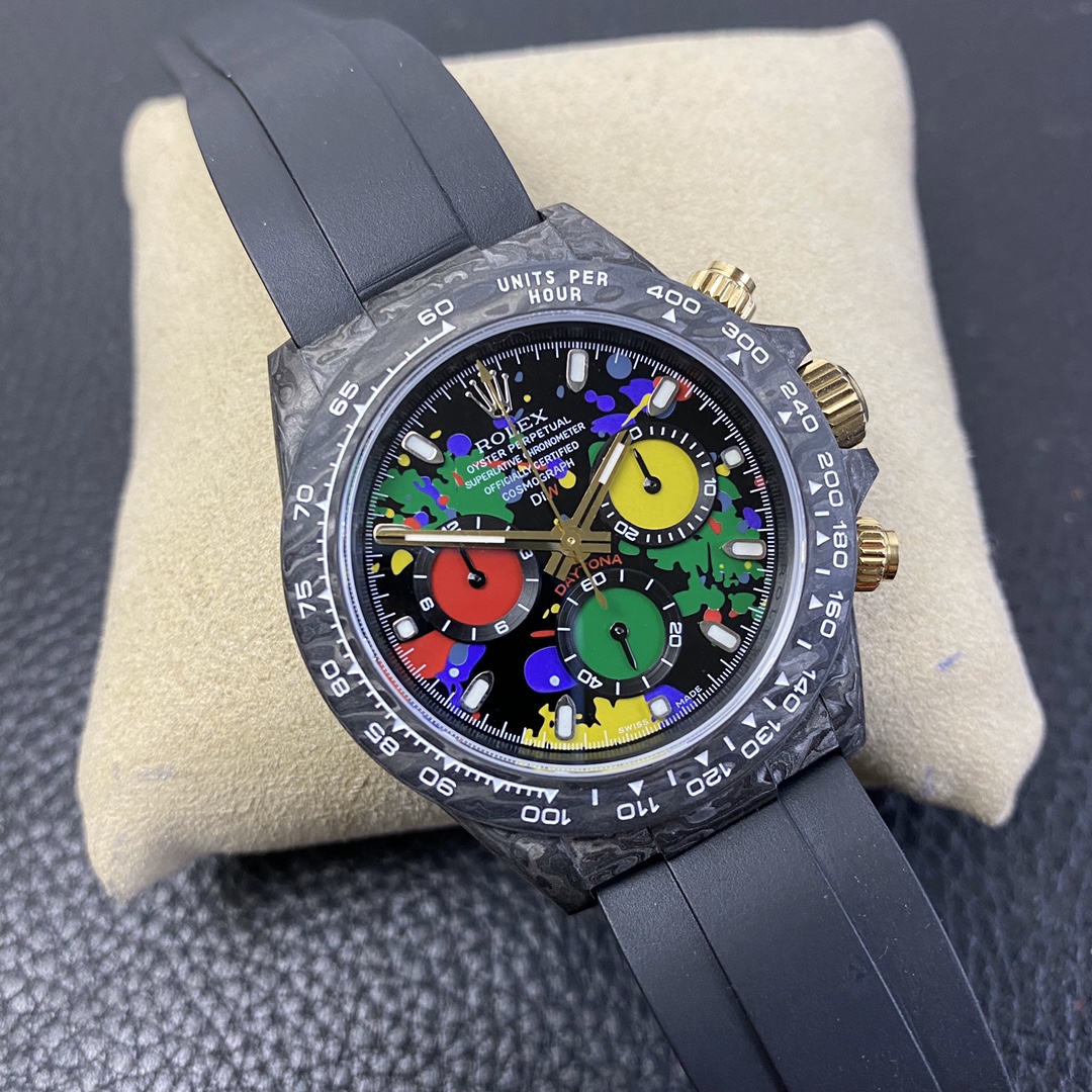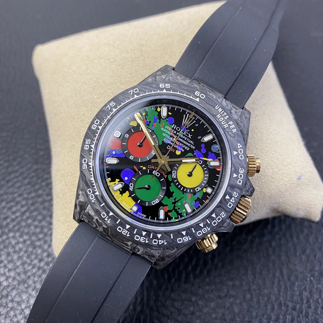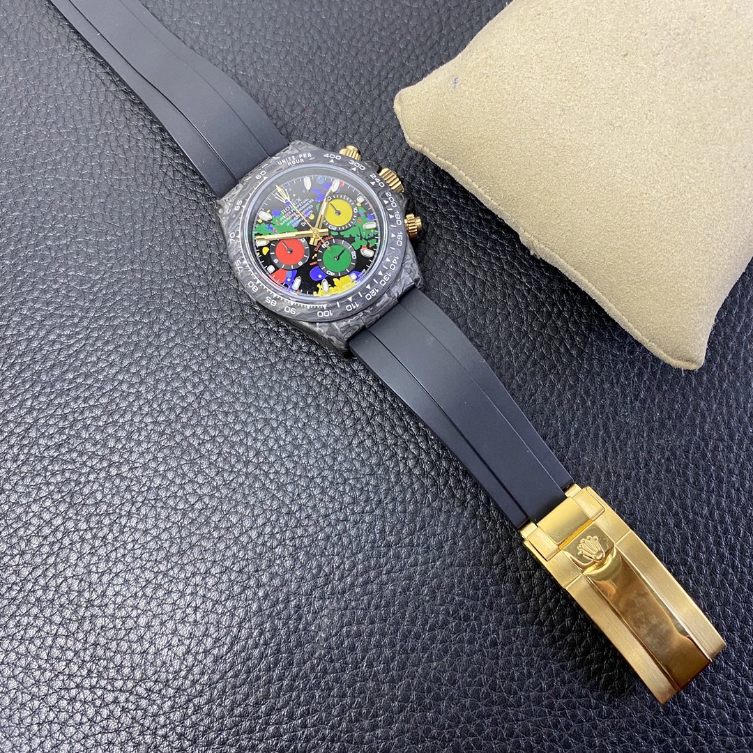 The Rolex Daytona watch exudes a sense of fashion and sportiness with its 40mm x 13mm size and sporty style. Equipped with a 7750 automatic movement, it ensures precise and reliable time display. The watch features hour, minute, and second functions, and is equipped with luminescent hands and markers, ensuring clear readability even in low-light environments. With a water resistance of 50 meters, the watch is suitable for waterproof demands in daily life. The sapphire crystal glass provides excellent scratch resistance and clear time display. The carbon fiber case exhibits lightweight and durability, presenting a modern feel. Equipped with a fabric strap, the watch adds a sporty style and a sense of fashion. This Rolex Daytona watch, with its outstanding performance and fashionable design, is an ideal choice for individuals who value quality and a sporty style.