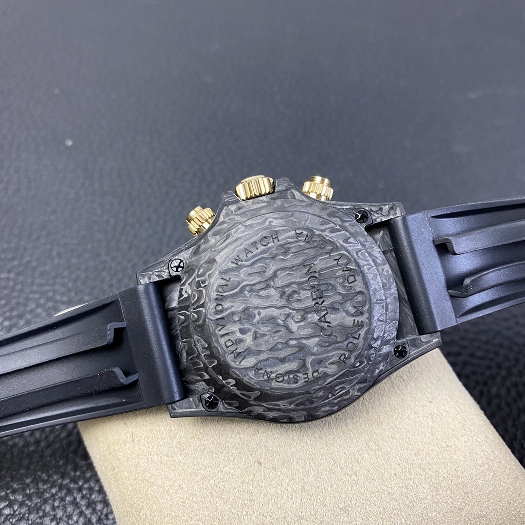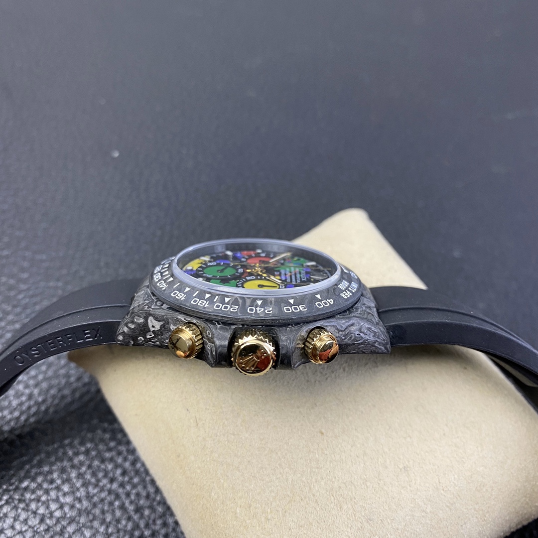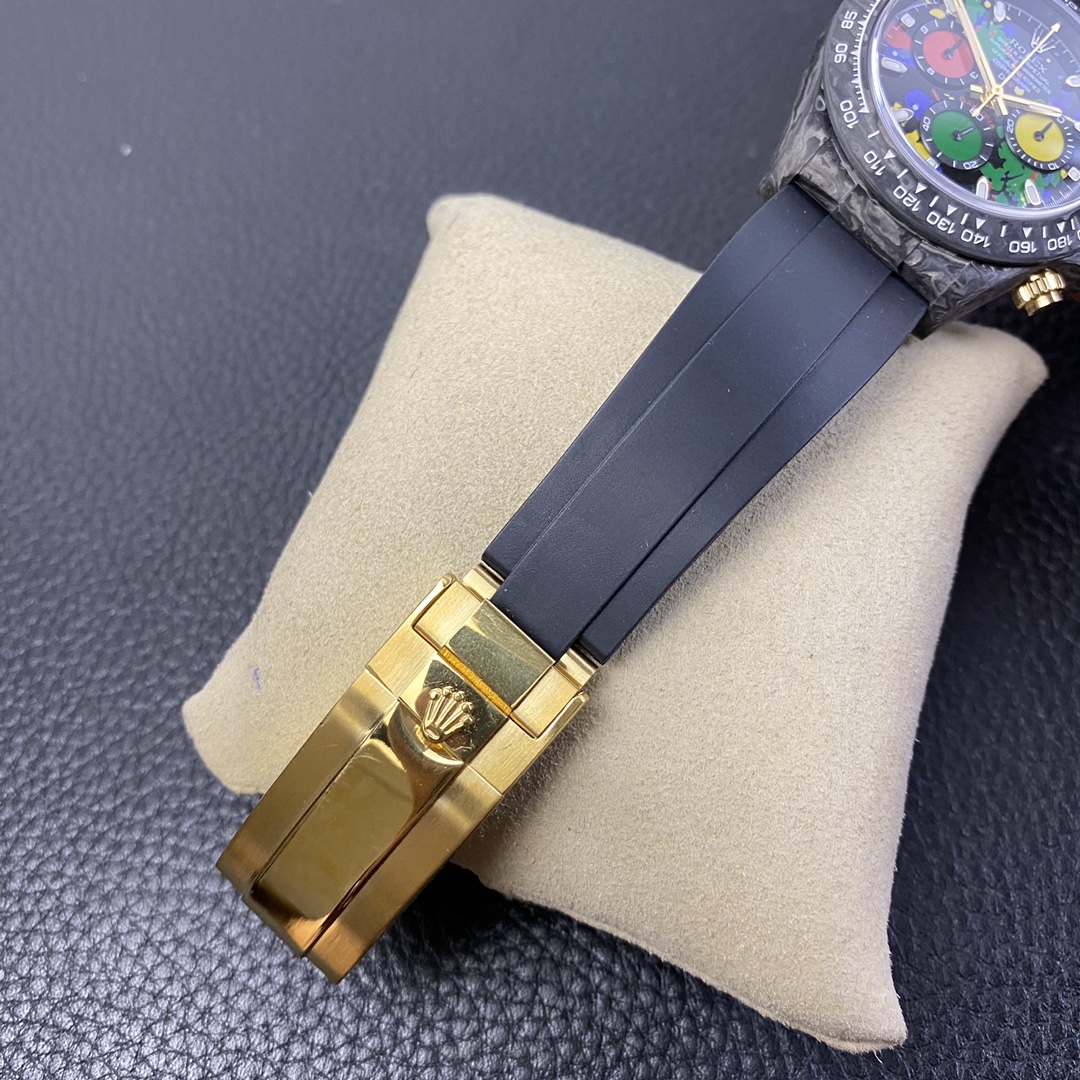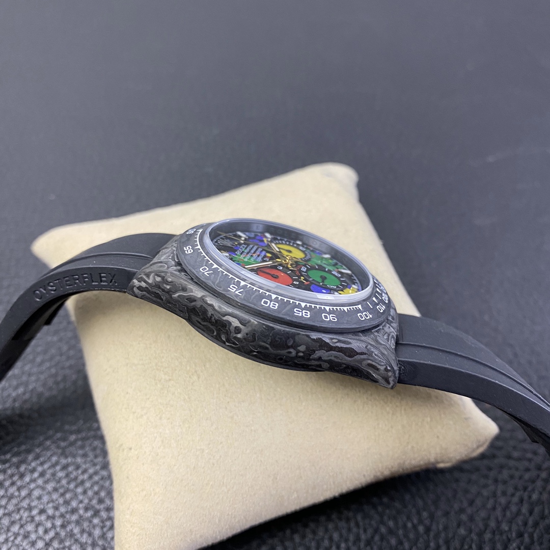 The Rolex Daytona watch exudes a sense of fashion and sportiness with its 40mm x 13mm size and sporty style. Equipped with a 7750 automatic movement, it ensures precise and reliable time display. The watch features hour, minute, and second functions, and is equipped with luminescent hands and markers, ensuring clear readability even in low-light environments. With a water resistance of 50 meters, the watch is suitable for waterproof demands in daily life. The sapphire crystal glass provides excellent scratch resistance and clear time display. The carbon fiber case exhibits lightweight and durability, presenting a modern feel. Equipped with a fabric strap, the watch adds a sporty style and a sense of fashion. This Rolex Daytona watch, with its outstanding performance and fashionable design, is an ideal choice for individuals who value quality and a sporty style.