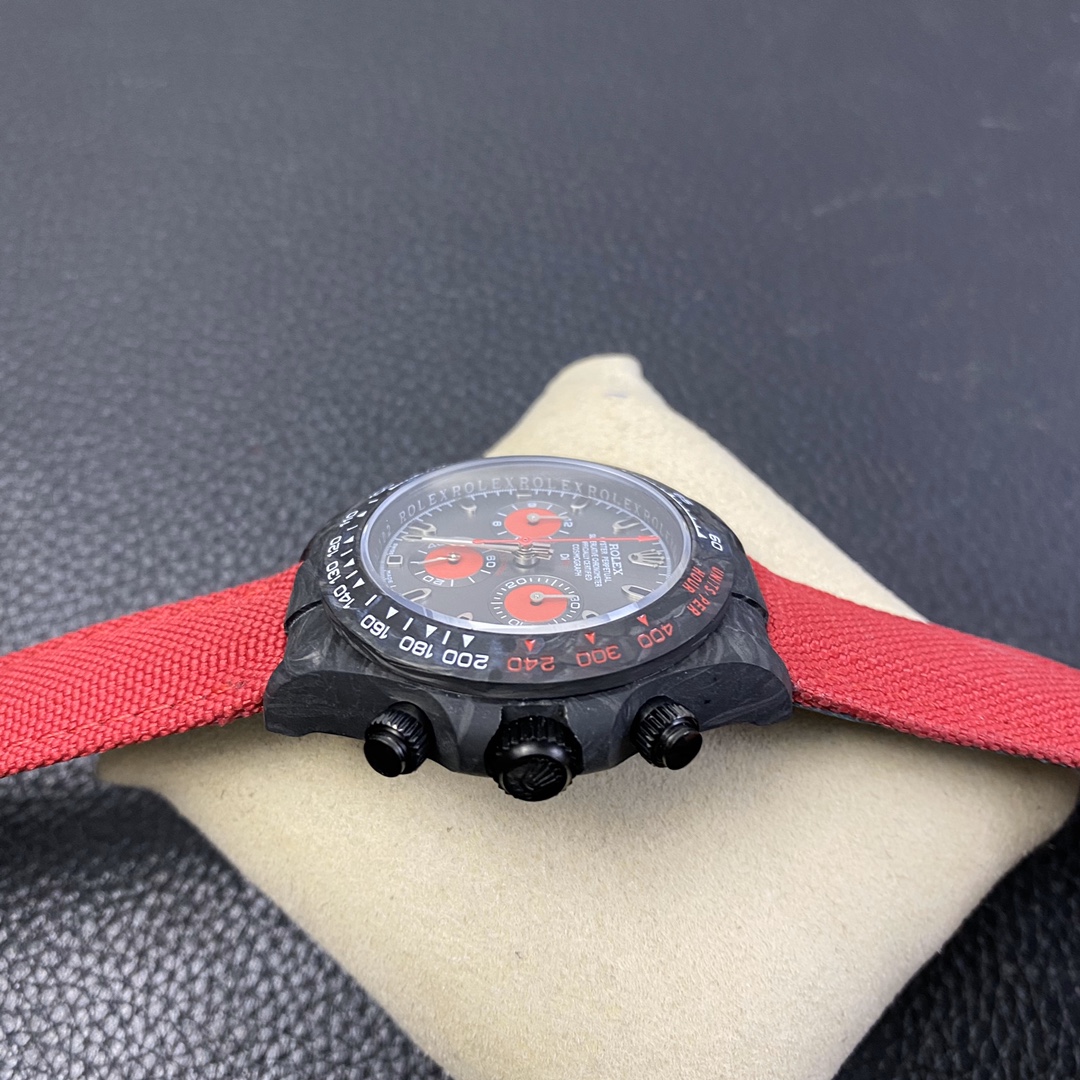 The Rolex Daytona watch exudes a sense of fashion and sportiness with its 40mm x 13mm size and sporty style. Equipped with a 7750 automatic movement, it ensures precise and reliable time display. The watch features hour, minute, and second functions, and is equipped with luminescent hands and markers, ensuring clear readability even in low-light environments. With a water resistance of 50 meters, the watch is suitable for waterproof demands in daily life. The sapphire crystal glass provides excellent scratch resistance and clear time display. The carbon fiber case exhibits lightweight and durability, presenting a modern feel. Equipped with a fabric strap, the watch adds a sporty style and a sense of fashion. This Rolex Daytona watch, with its outstanding performance and fashionable design, is an ideal choice for individuals who value quality and a sporty style.