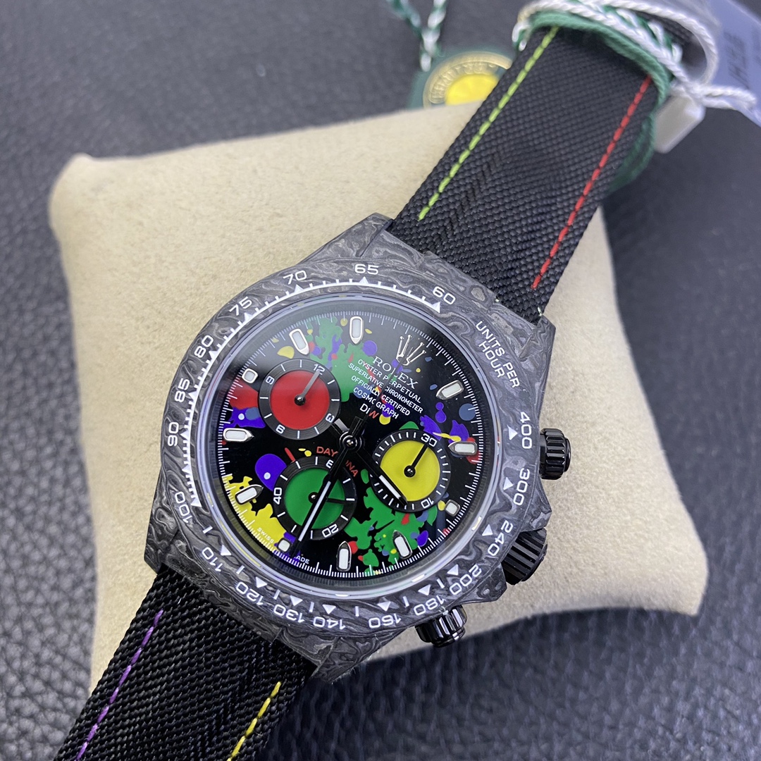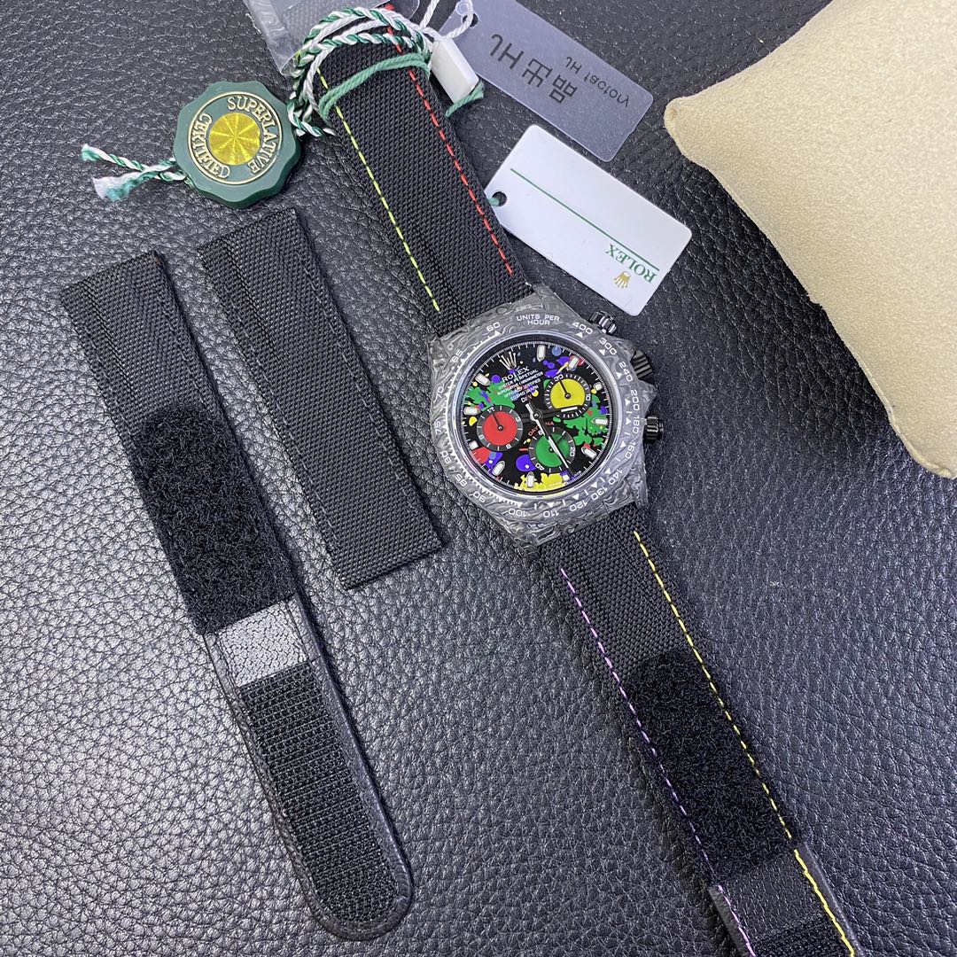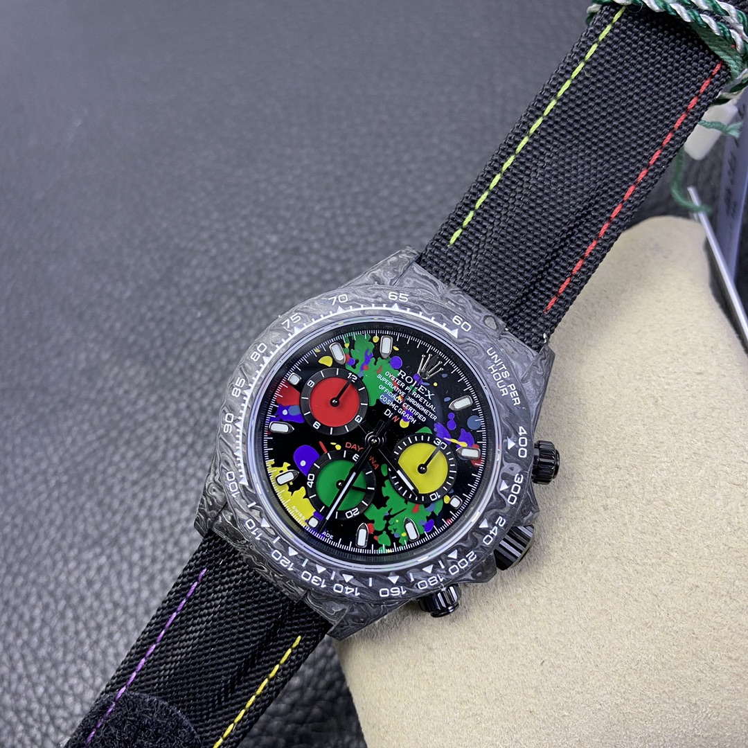 The Rolex Daytona watch exudes a sense of fashion and sportiness with its 40mm x size and sporty style. Equipped with a 7750 automatic movement, it ensures precise and reliable time display. The watch features hour, minute, and second functions, and is equipped with luminescent hands and markers, ensuring clear readability even in low-light environments. With a water resistance of 50 meters, the watch is suitable for waterproof demands in daily life. The sapphire crystal glass provides excellent scratch resistance and clear time display. The carbon fiber case exhibits lightweight and durability, presenting a modern feel. Equipped with a fabric strap, the watch adds a sporty style and a sense of fashion. This Rolex Daytona watch, with its outstanding performance and fashionable design, is an ideal choice for individuals who value quality and a sporty style.