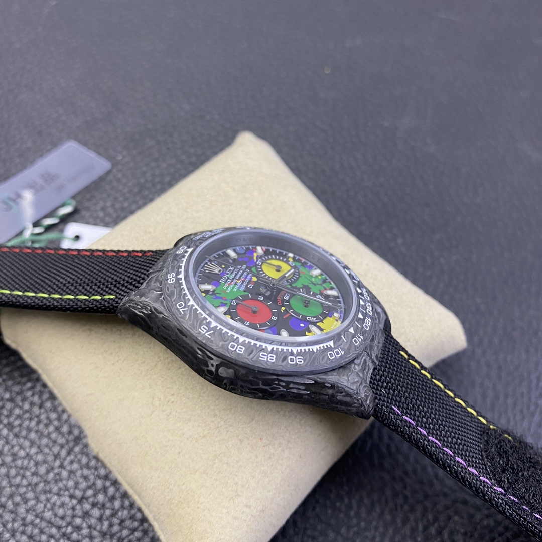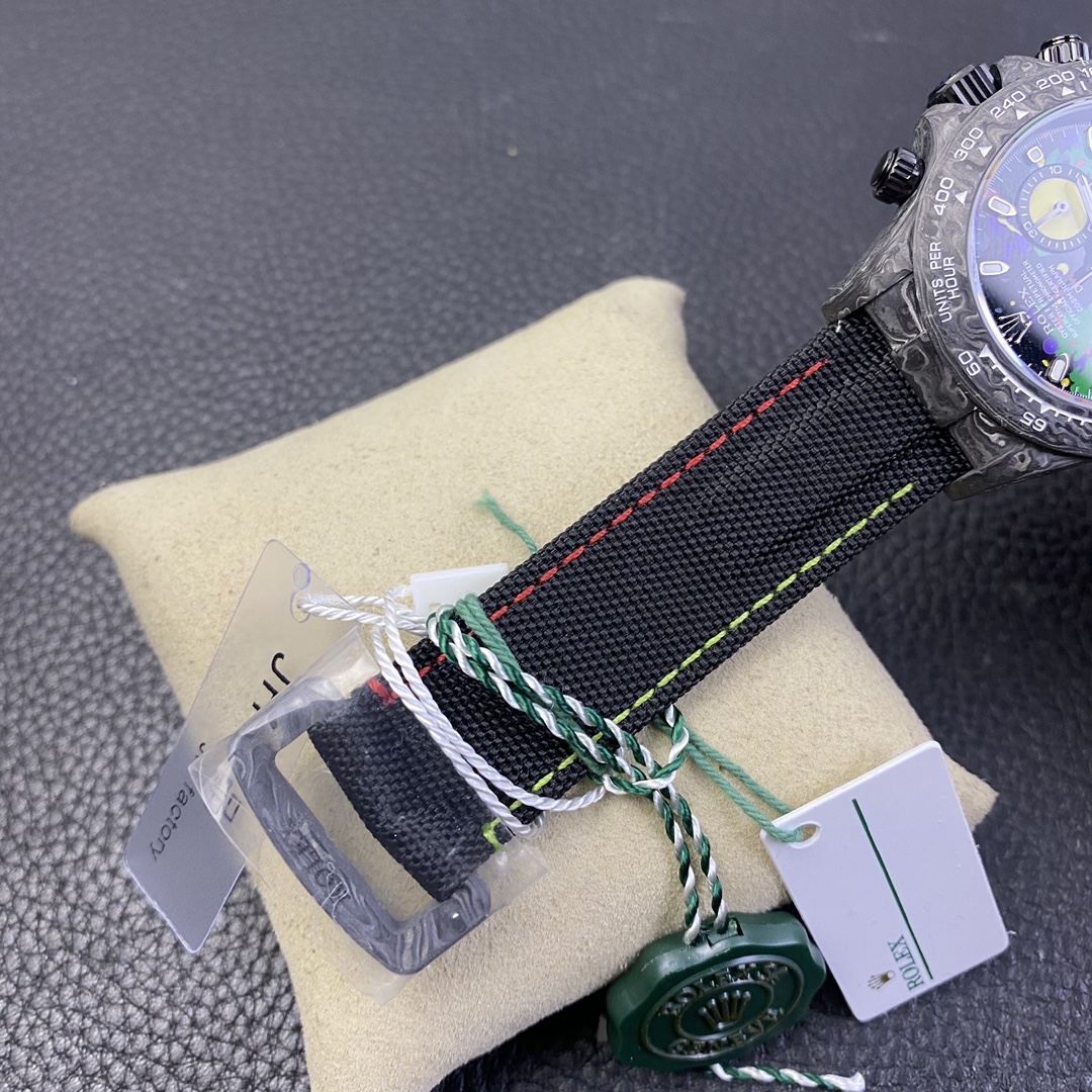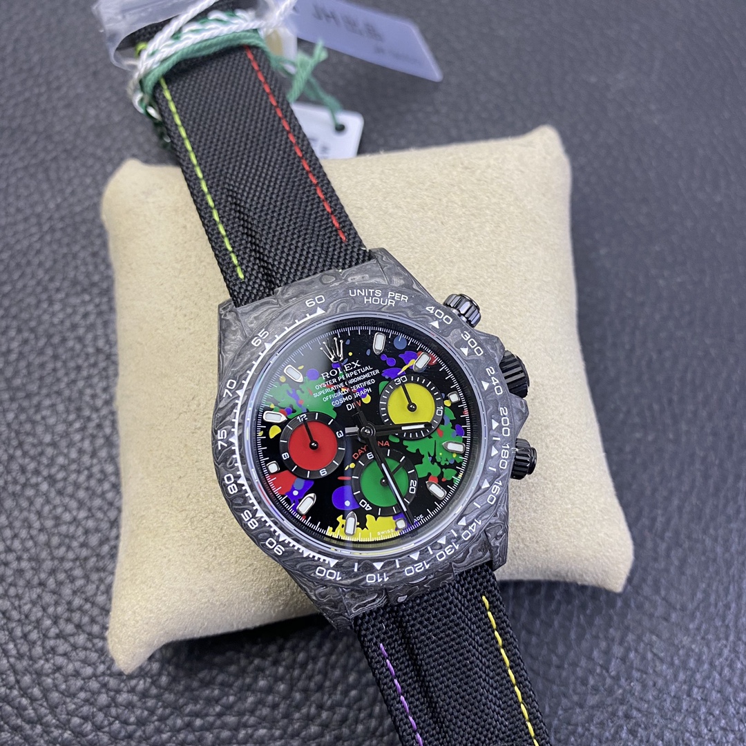 The Rolex Daytona watch exudes a sense of fashion and sportiness with its 40mm x size and sporty style. Equipped with a 7750 automatic movement, it ensures precise and reliable time display. The watch features hour, minute, and second functions, and is equipped with luminescent hands and markers, ensuring clear readability even in low-light environments. With a water resistance of 50 meters, the watch is suitable for waterproof demands in daily life. The sapphire crystal glass provides excellent scratch resistance and clear time display. The carbon fiber case exhibits lightweight and durability, presenting a modern feel. Equipped with a fabric strap, the watch adds a sporty style and a sense of fashion. This Rolex Daytona watch, with its outstanding performance and fashionable design, is an ideal choice for individuals who value quality and a sporty style.
