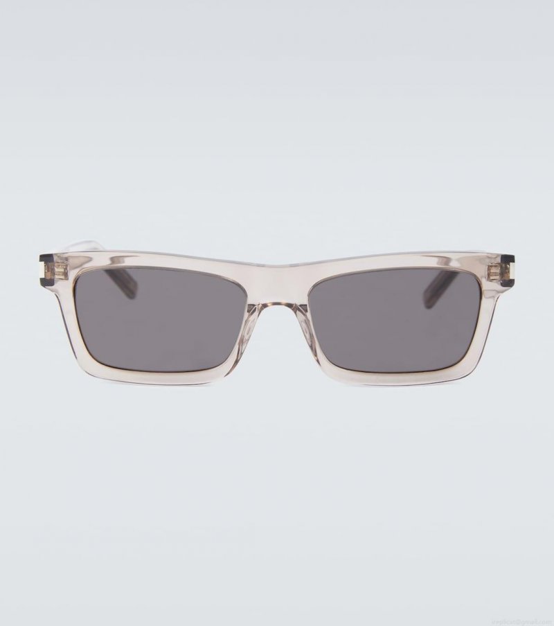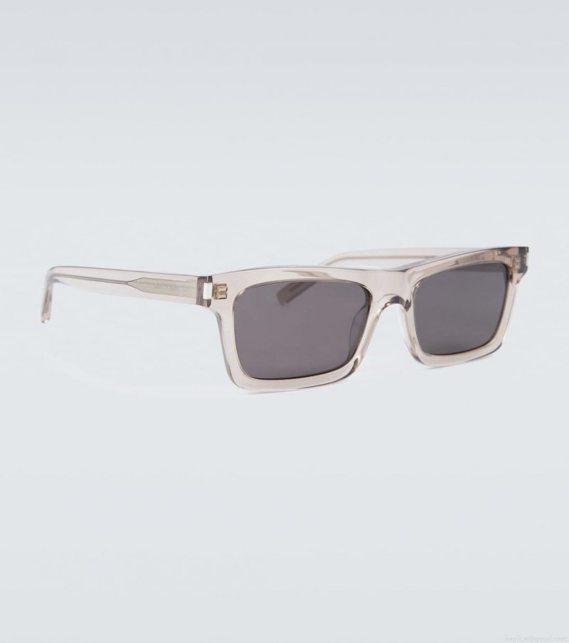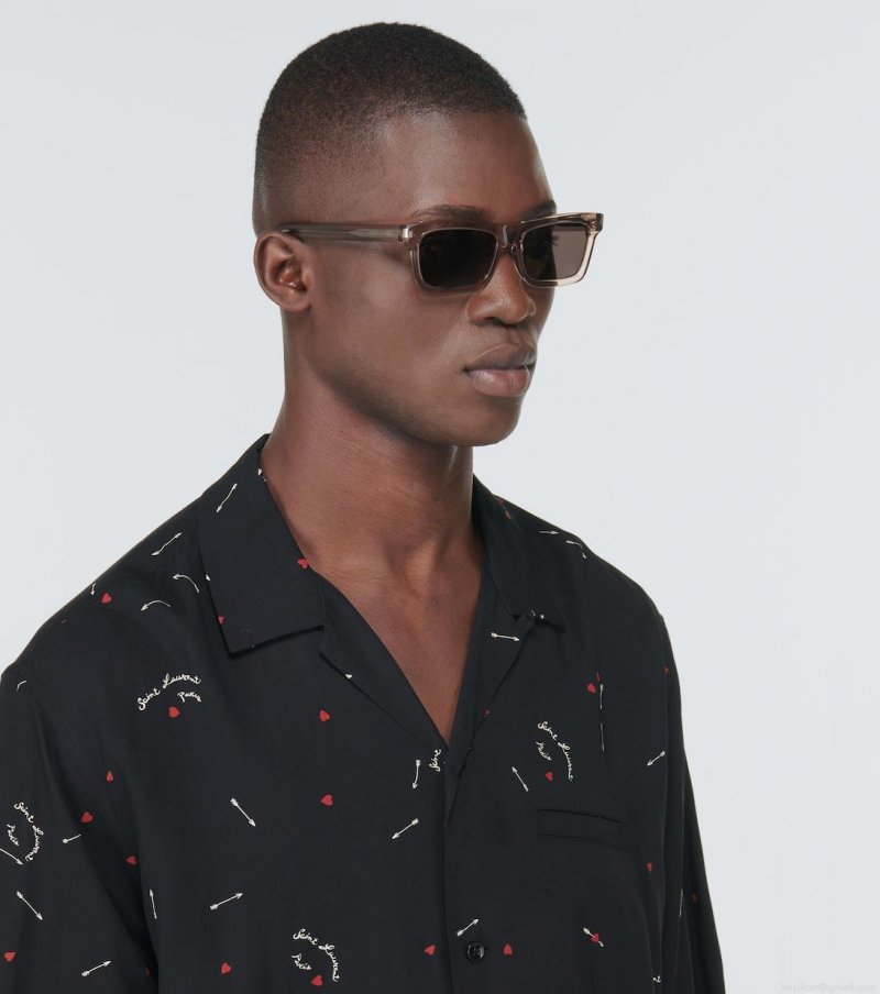 The Betty sunglasses from Saint Laurent are distinguished by their unique rectangular acetate frames. Black-tinted lenses are surrounded by light brown frames, engraved across the temple with the brand’s logo. These sunglasses come in a protective case, the color of which may vary.