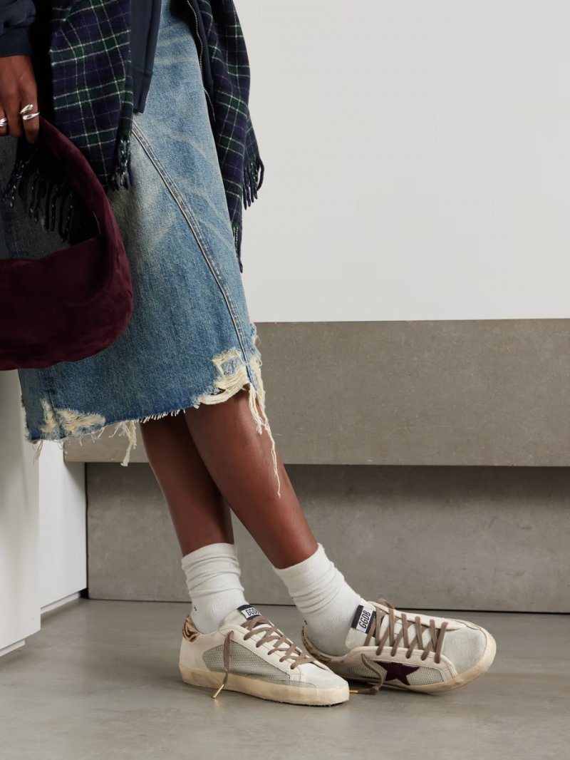 - Cream leather (Cow), tonal-brown zebra-print calf hair, light-grey and burgundy suede, off-white mesh