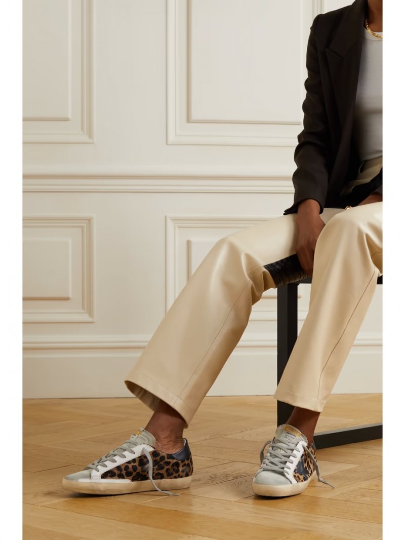 - Leopard-print calf hair, off-white and black leather, off-white suede