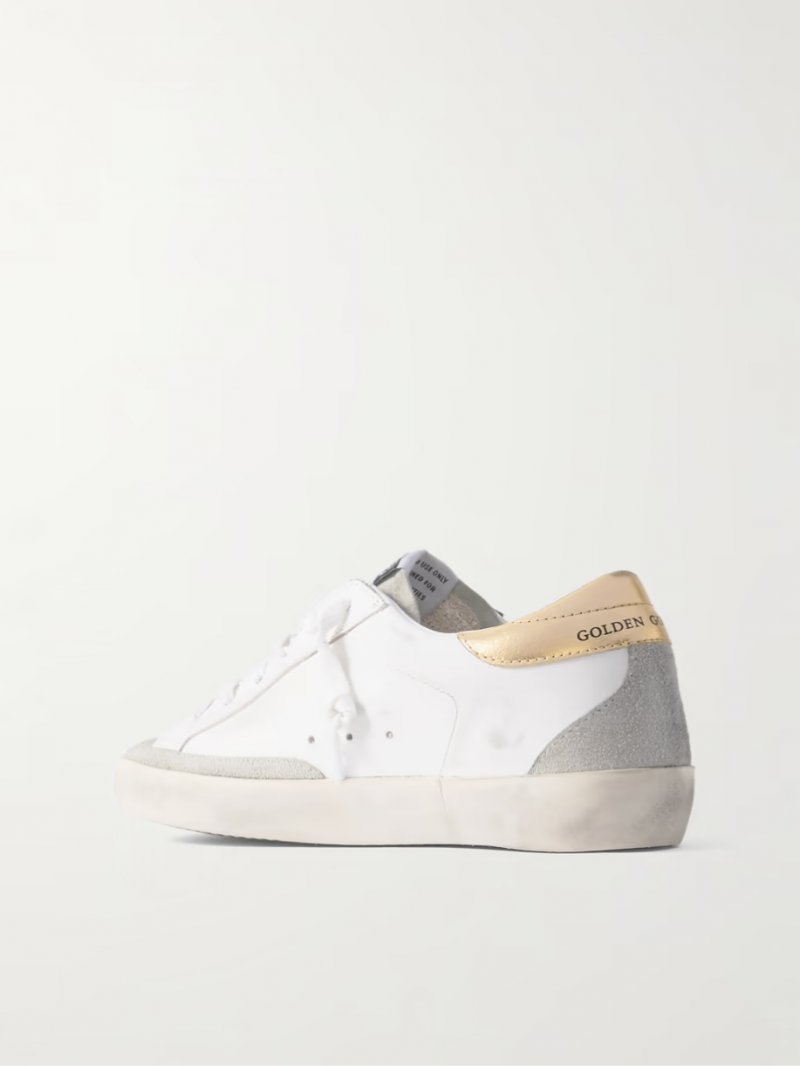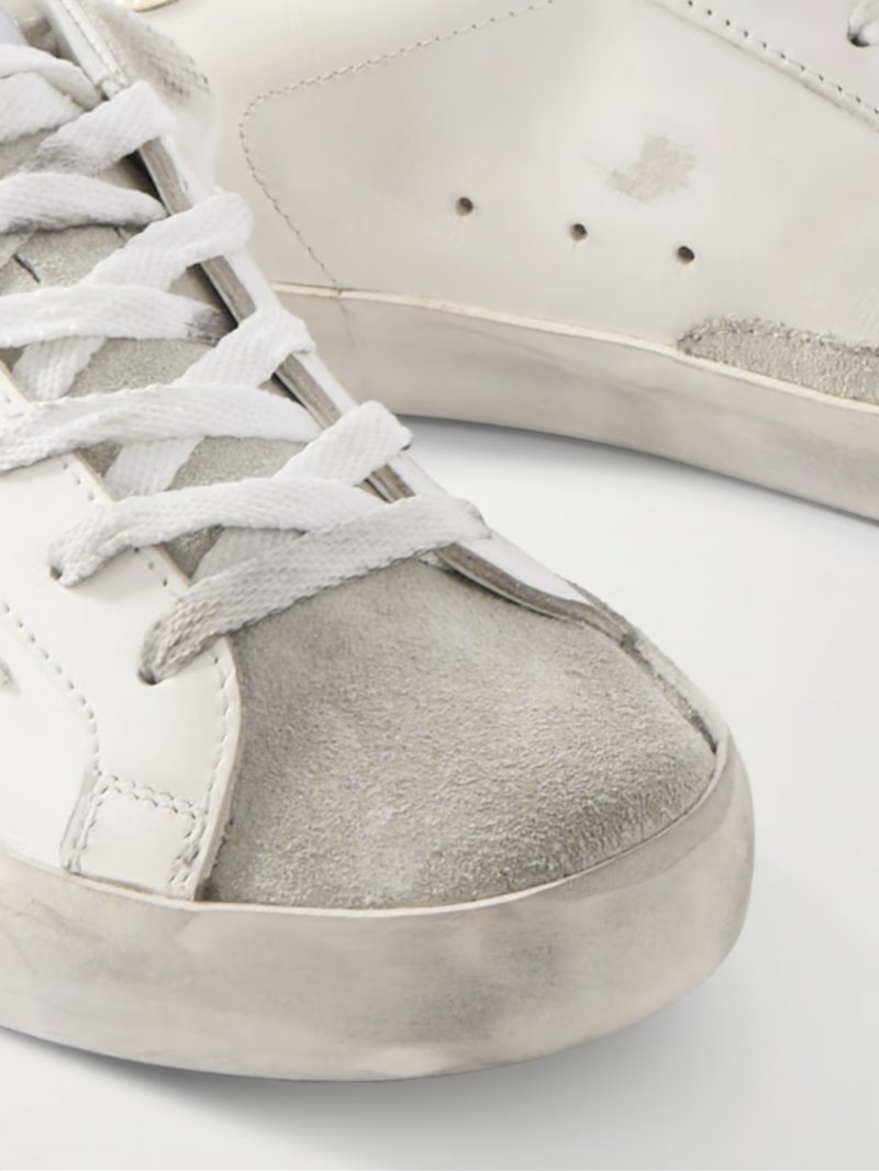 - White and rose gold leather, gray suede