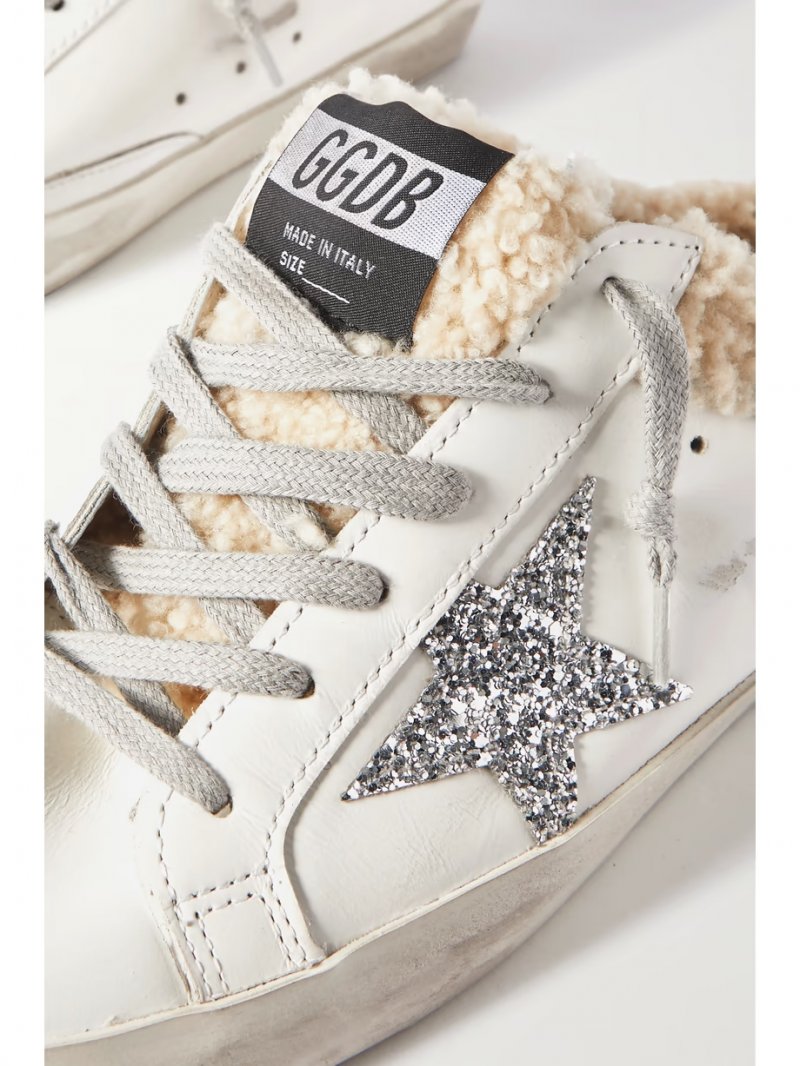 - White leather, silver glittered leather (Cow), beige shearling (Sheep)