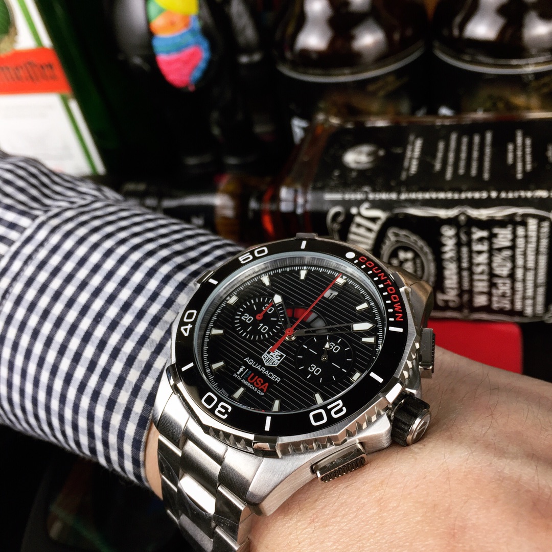 Equipped with a Japanese multifunctional quartz chronograph movement, sandblasted stainless steel case, engraved decorative pattern, screw-in crown, unidirectional rotating bezel, black PVD stainless steel folding clasp, 41mm dial diameter. Embrace the speed and passion on your wrist, fulfilling your unrealized racing dreams.