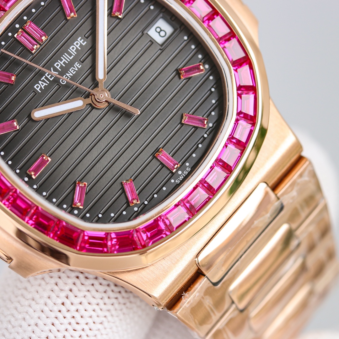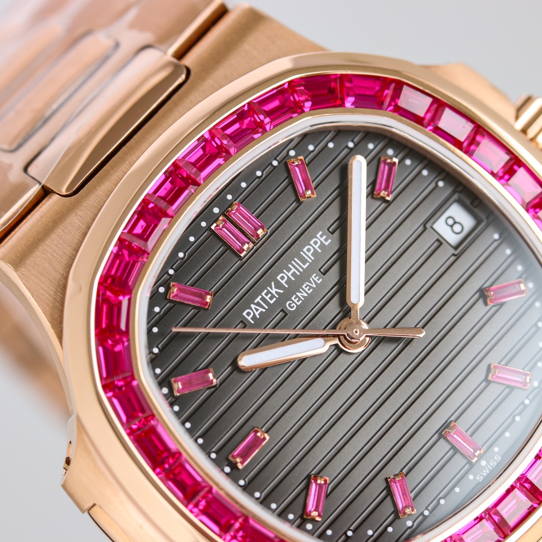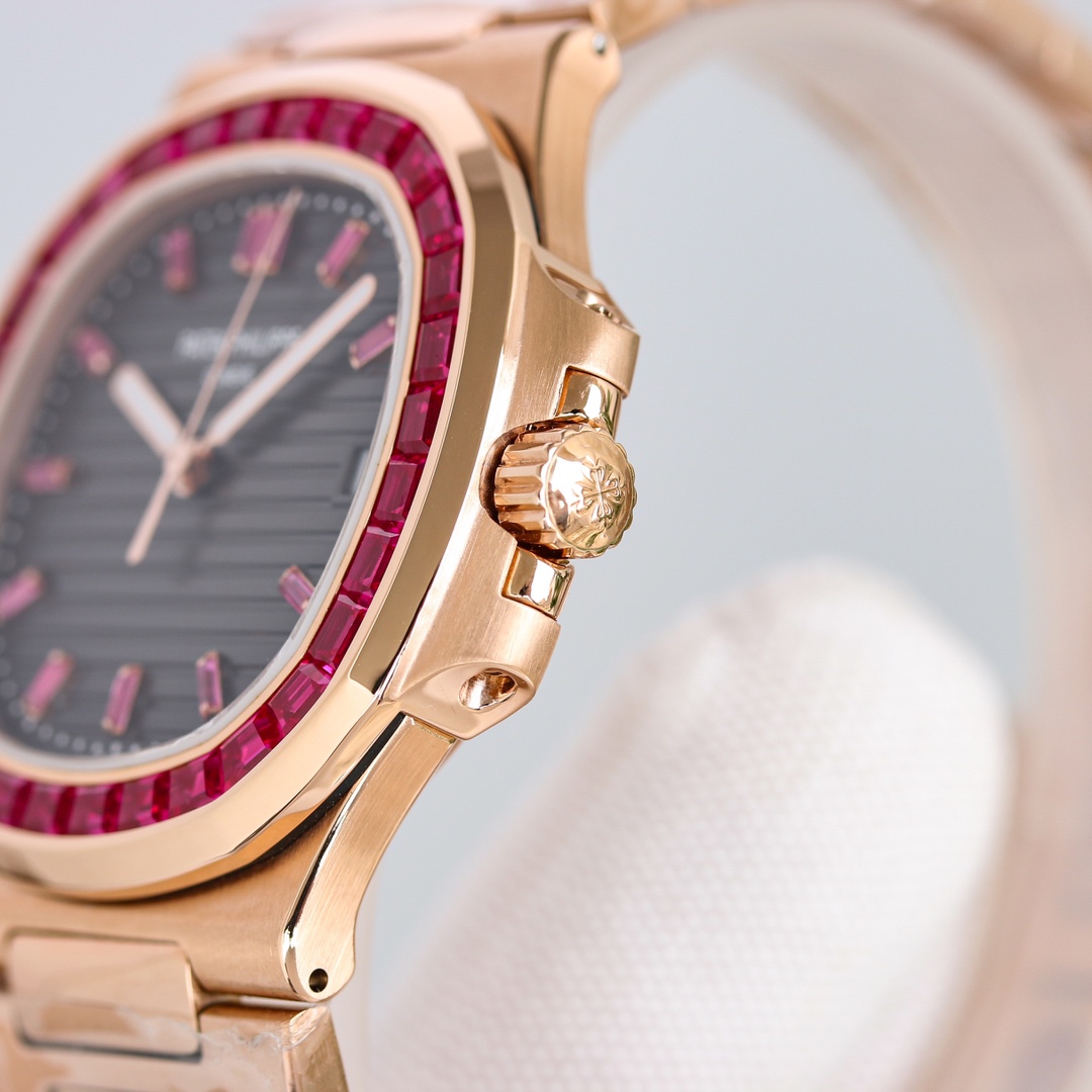 Exquisite diamonds are meticulously set on the case, reflecting a beautiful radiance. The presence of rubies and emeralds enhances the Nautilus’s elegance and sophistication.
