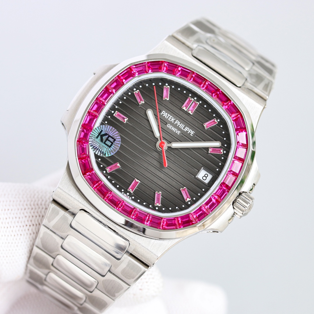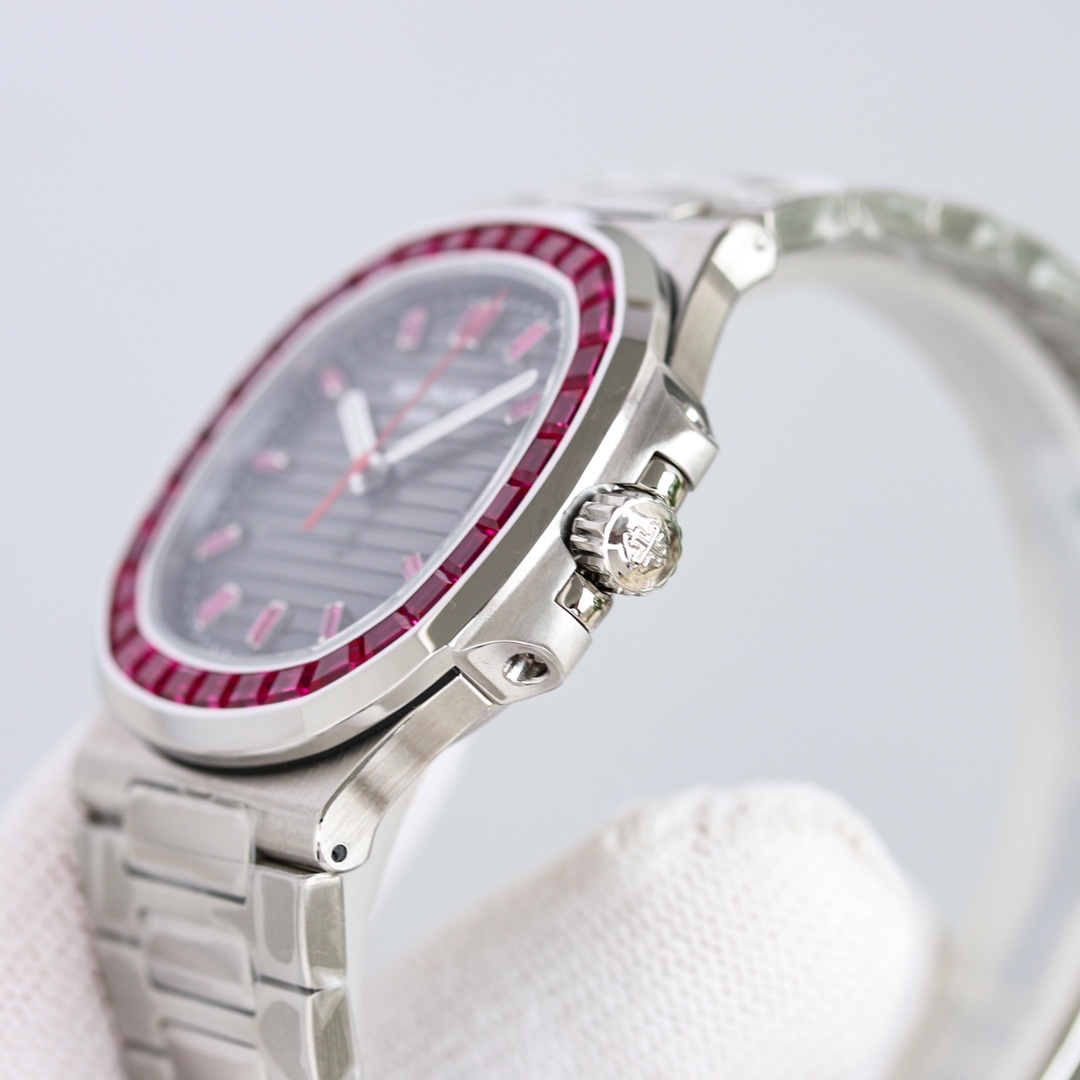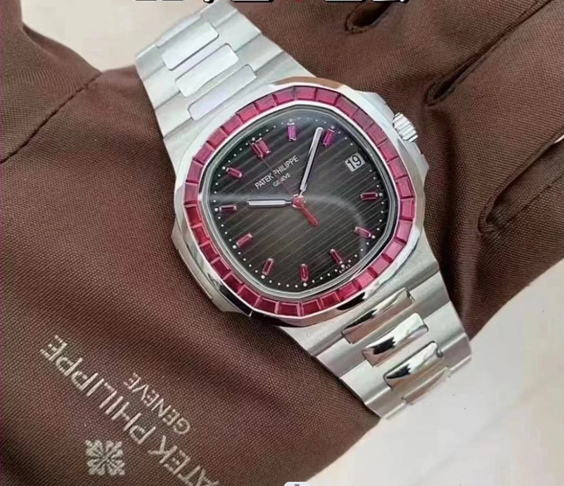 Exquisite diamonds are meticulously set on the case, reflecting a beautiful radiance. The presence of rubies and emeralds enhances the Nautilus’s elegance and sophistication.