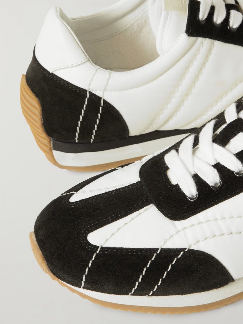 - Black suede, white shell, off-white leather